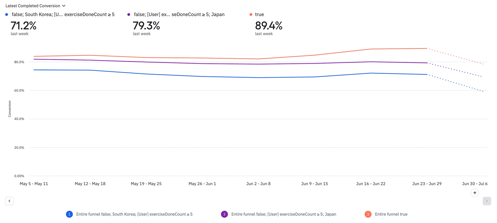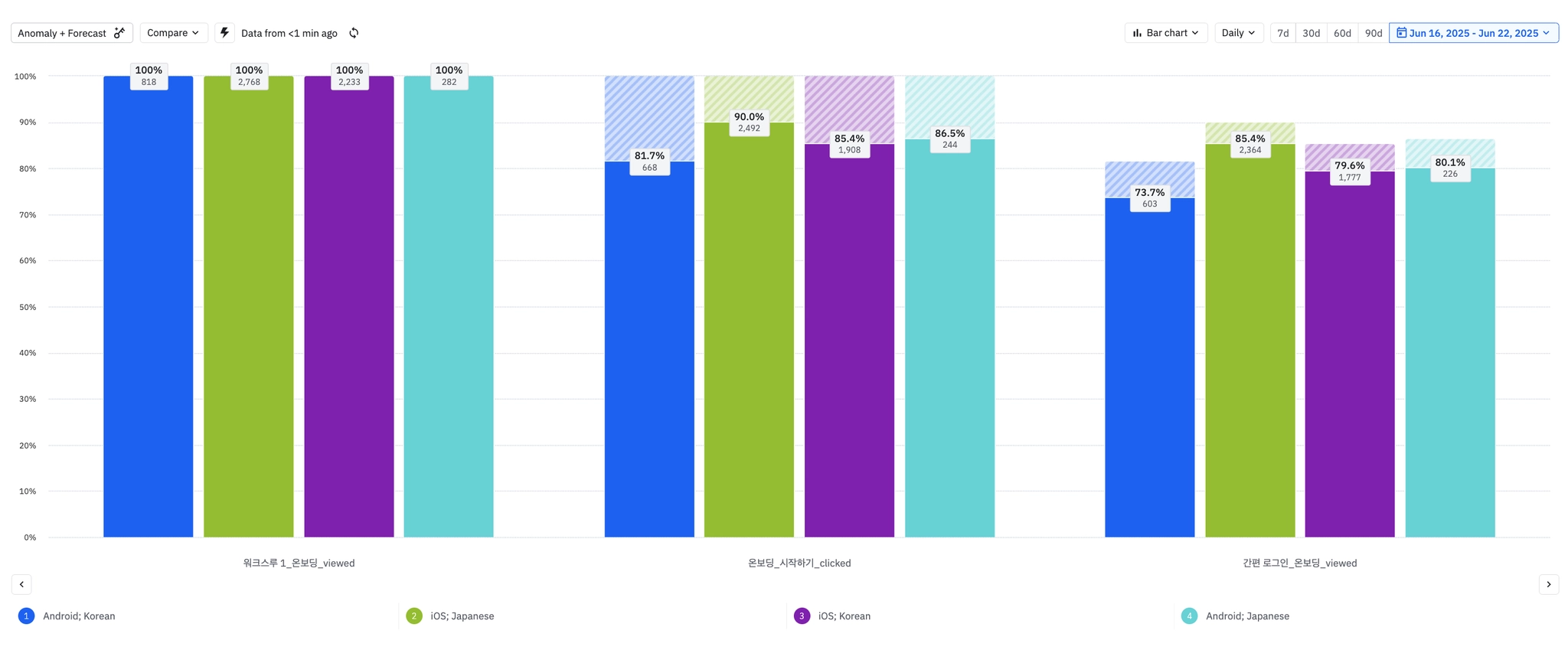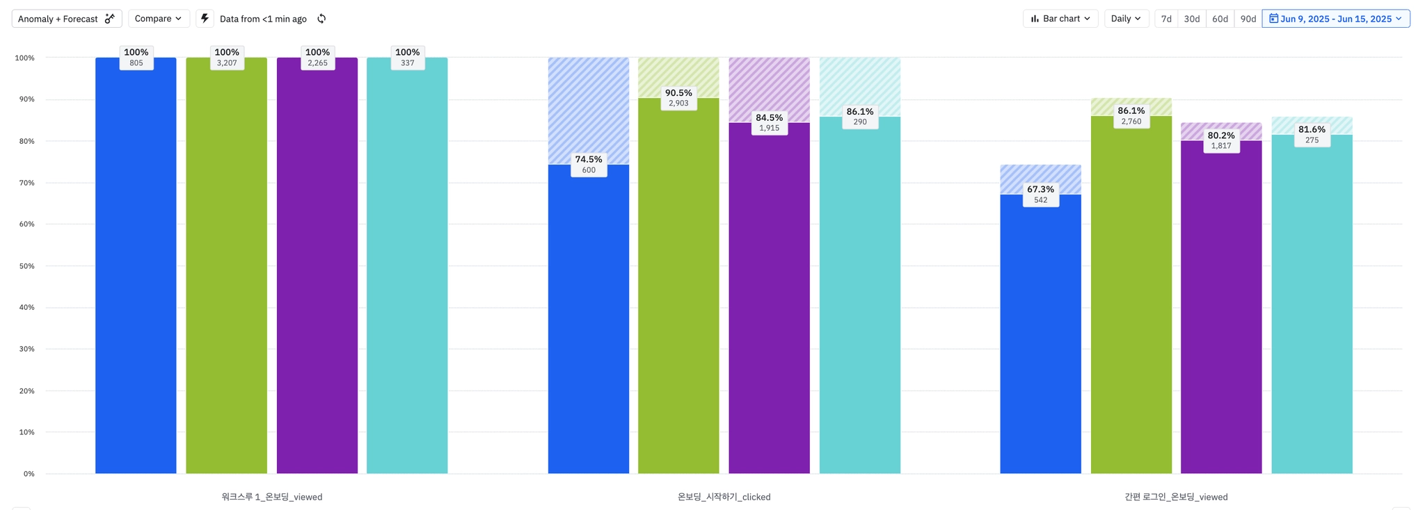 온보딩 완료 퍼널 변화 | 67.3 → 73.7 → 75.4 |