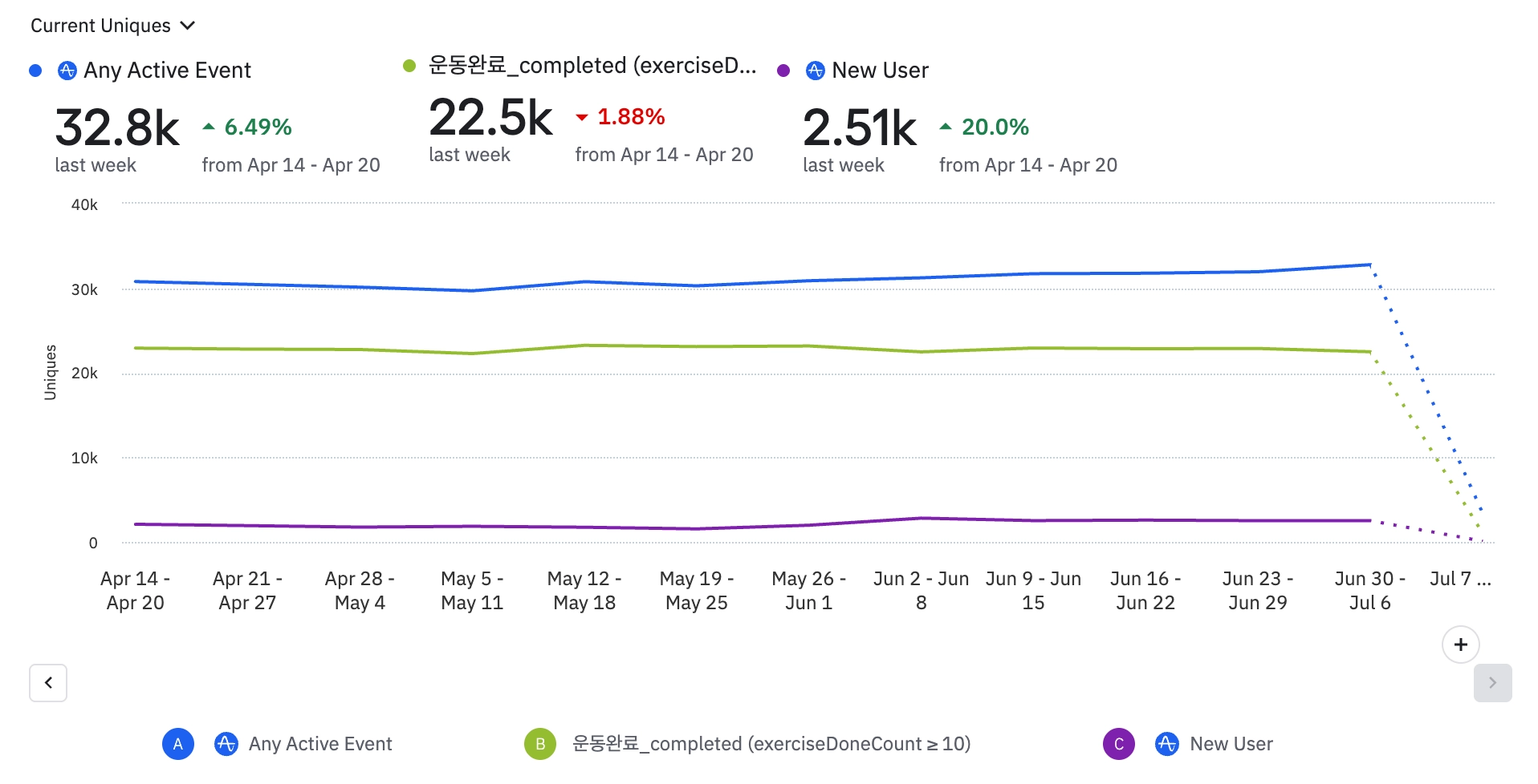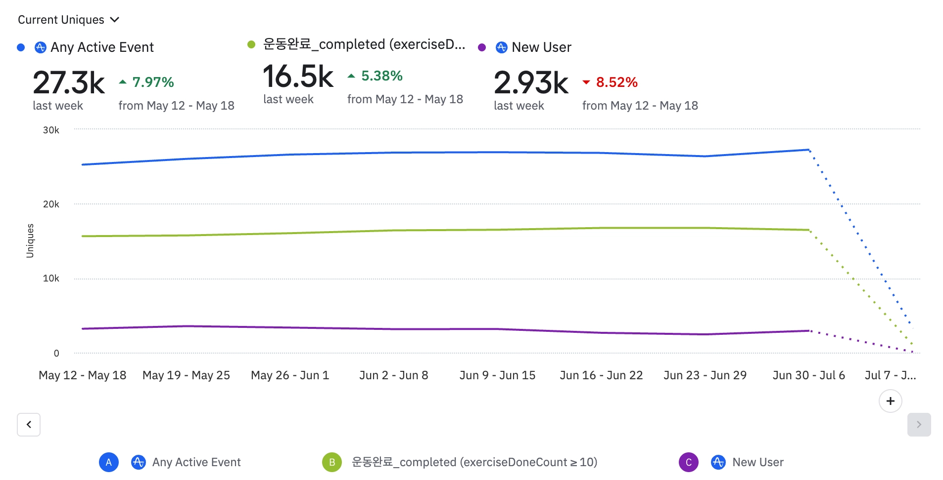 6월 12일 업데이트 일자 기준으로 바텀시트 호출 → CTA 클릭은 늘었으나, 구독 페이지까지의 전환율은 효율이 좋지 않아 메인 비주얼 추가, 컴포넌트 순서 수정으로 페이지 재구성하여 지표 트래킹할 예정