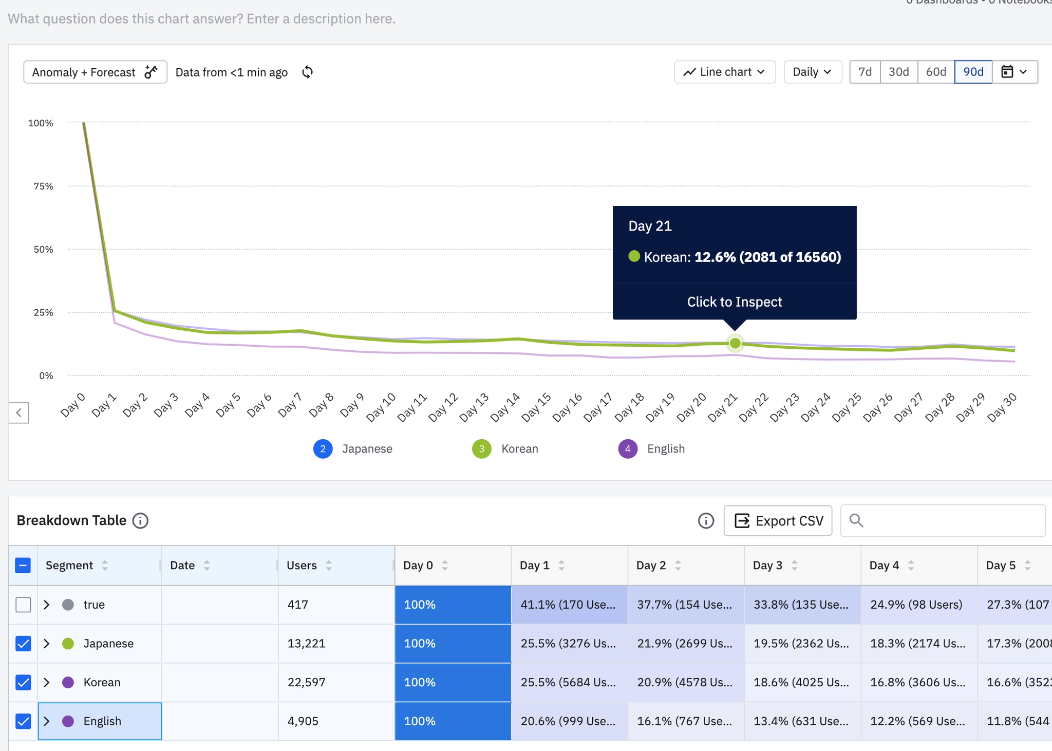 <2월 1일 기준 90일간 데일리 리텐션 지표 (amplitude)>