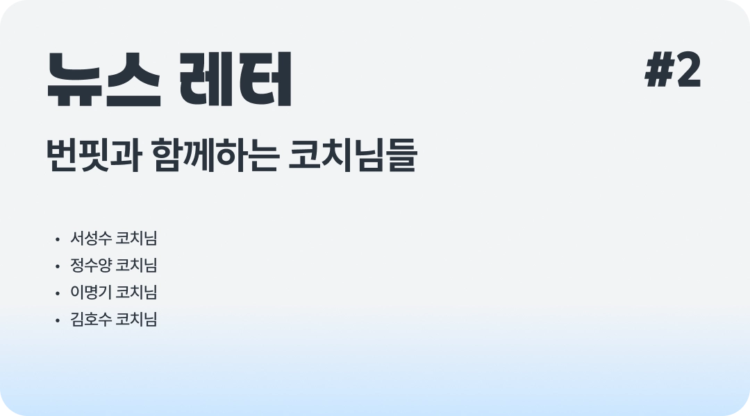 앞으로 보내드릴 소식에도 수준 높은 코치님들을 소개해드릴 예정이니 많은 기대 부탁드립니다!