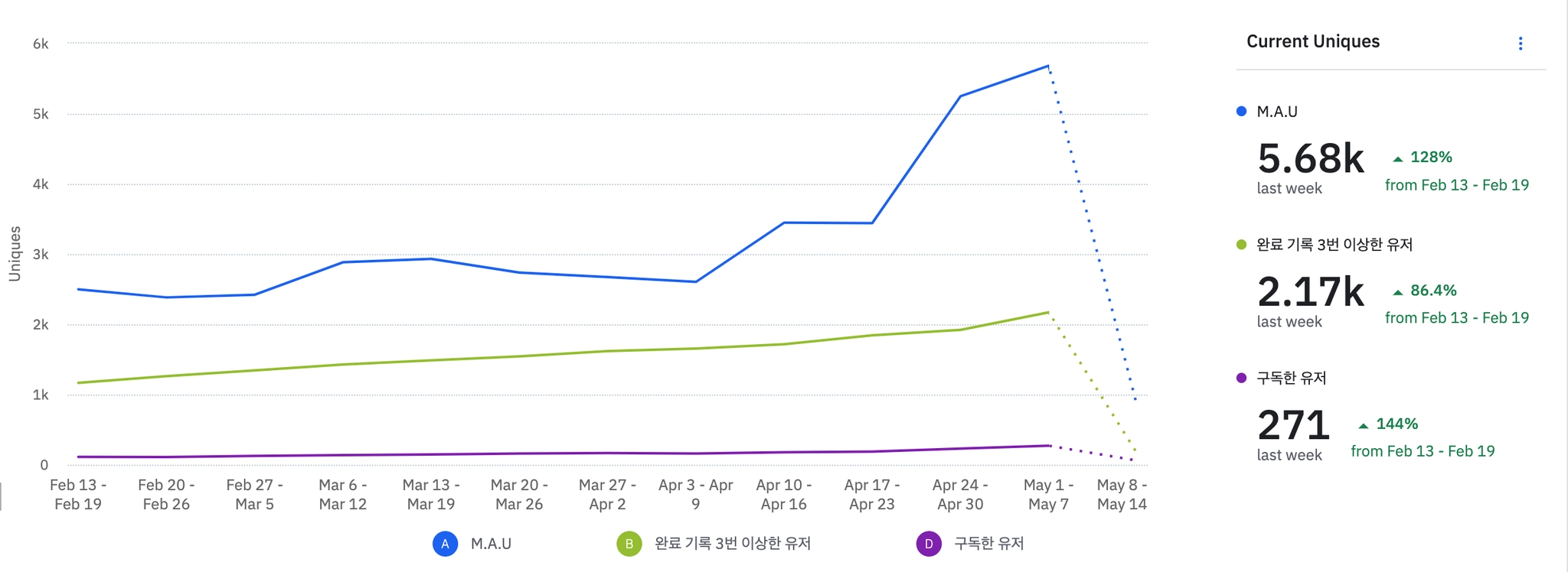 5월1주차 | 2140 | 19350 | 0 | 2258 | 1788(+80) | ₩385,781 |