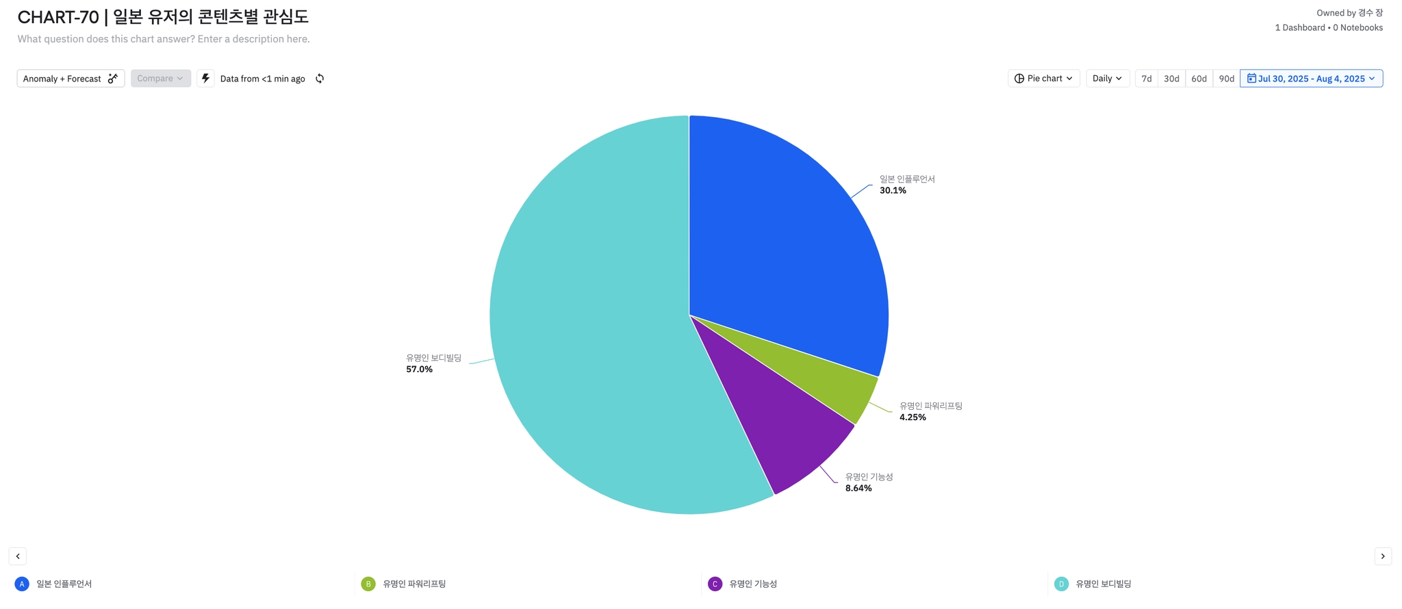 유명인 보디빌딩 57% / 일본 인플루언서 30.1% / 유명인 기능성 8.6% / 유명인 파워리프팅 4.2% 순으로 관심도를 보인다.