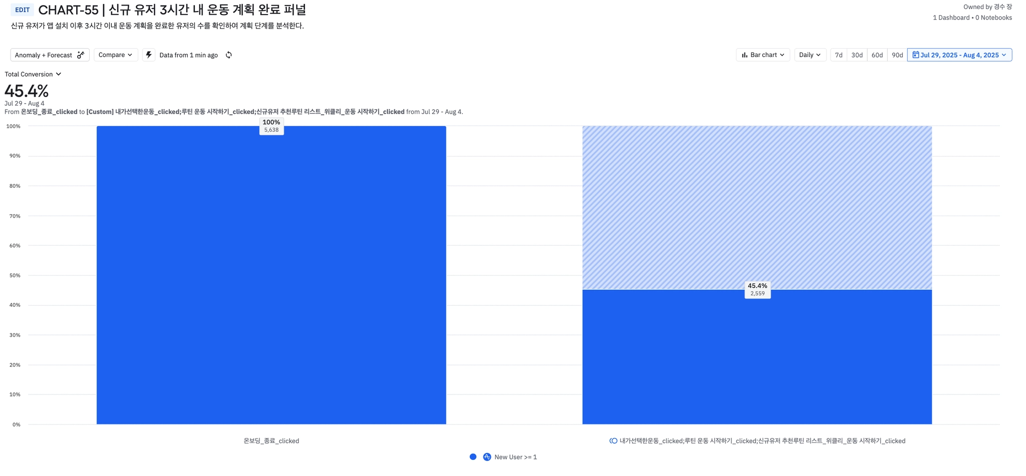 7월 20일 ~ 8월 4일 3시간 내 운동 완료율 45.4%