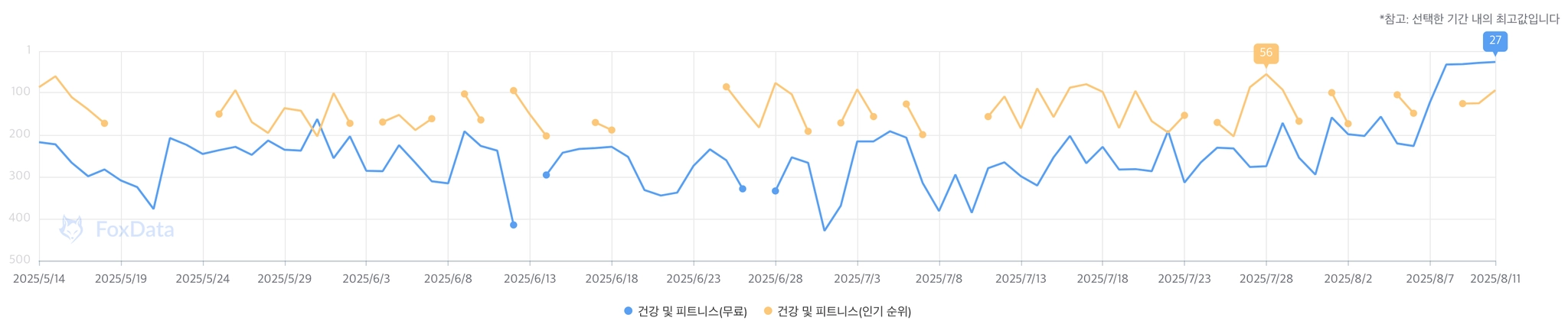 위클리 업데이트 이후 2배 상승한 뒤 하락세로 이어지다 정체하였다.
