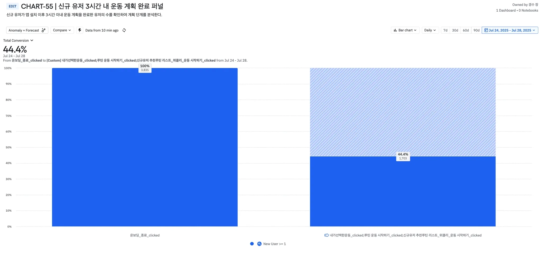 7월 24일 ~ 7월 28일 3시간 내 운동 계획 완료율 44.4%