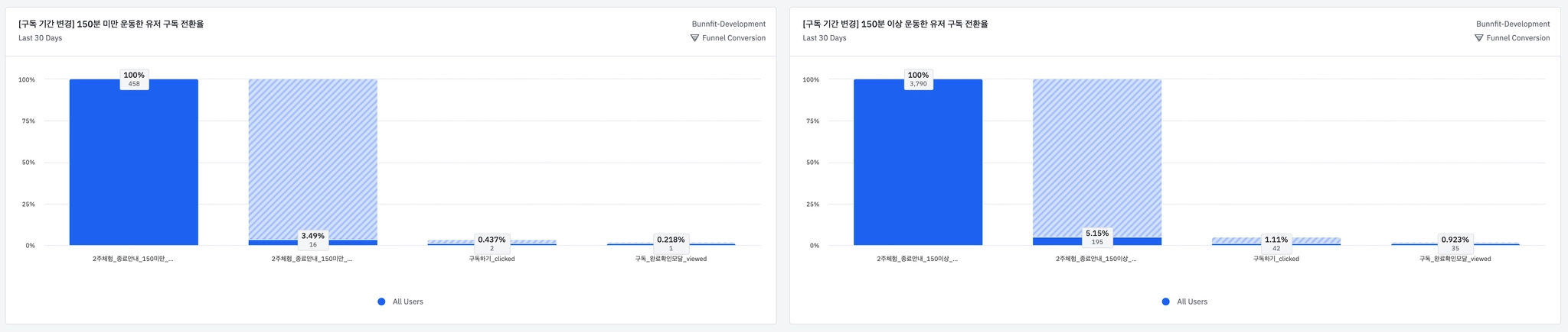 150분 이상 운동한 유저 구독 전환율이 높지만, 모달을 보고 이탈하는 유저의 비율이 90% 이상 넘는 상태