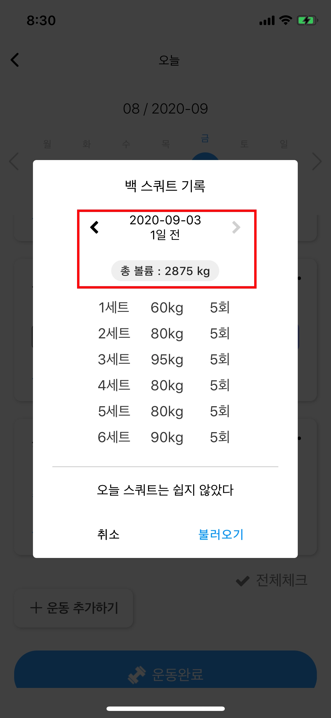 "최근기록보기" / 에서 해당 운동별 총 볼륨을 확인할 수 있습니다.