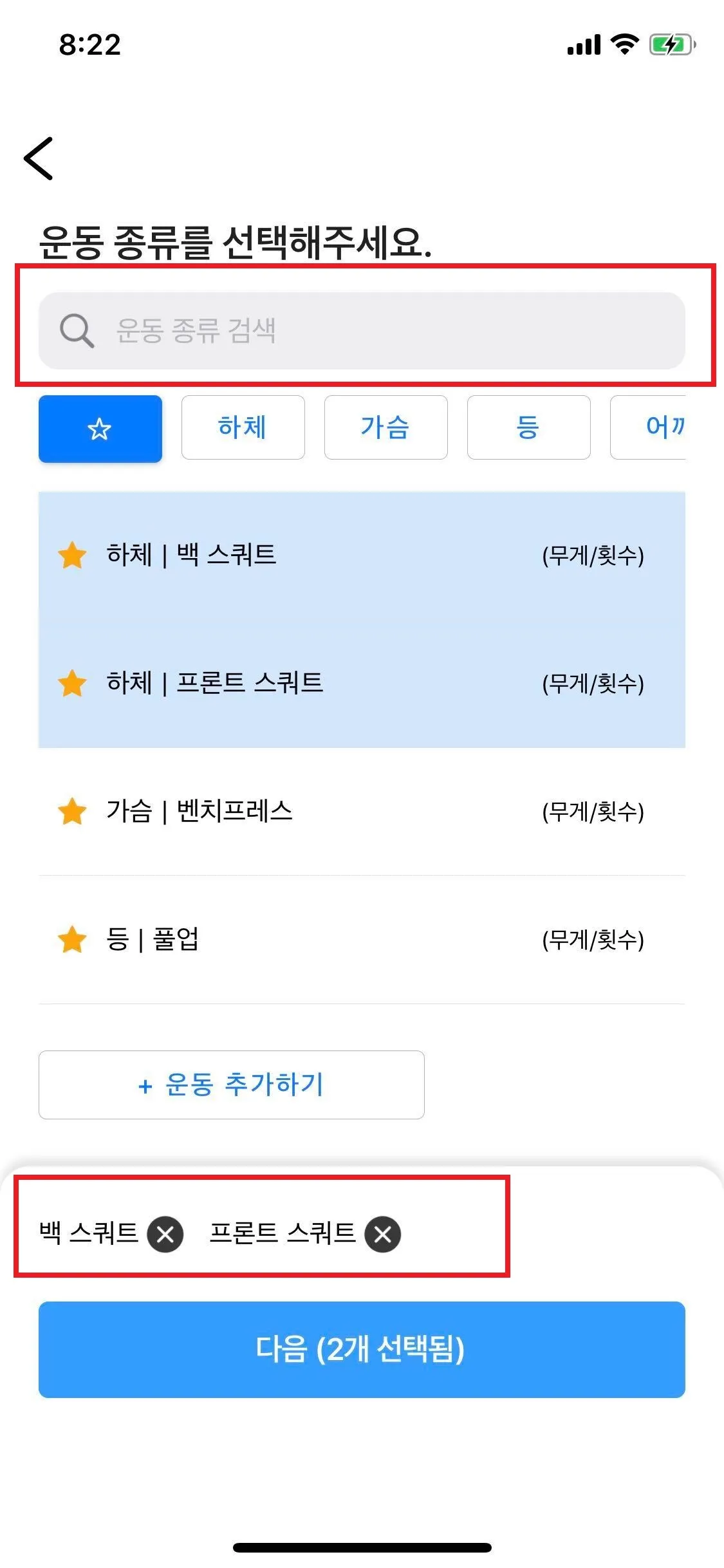 이제 선택한 운동의 이름을 한눈에 확인할 수 있을뿐만 아니라, 운동 검색을 통해 보다 빠르게 운동을 고를 수 있습니다.