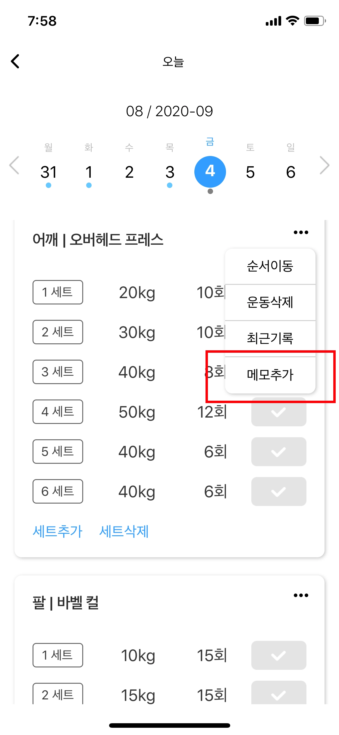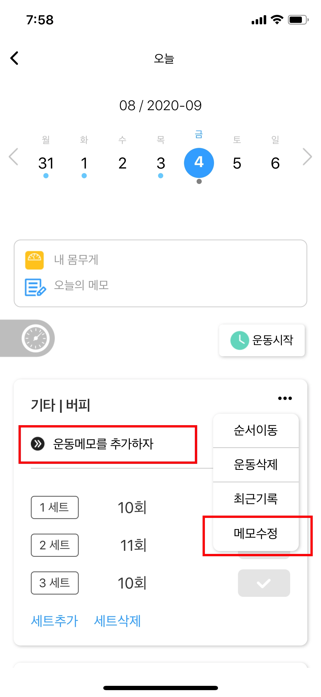 이제 각 운동별로 메모를 추가할 수 있어요. 각 운동의 오른쪽 상단 메뉴를 통해 메모를 추가해봐요!