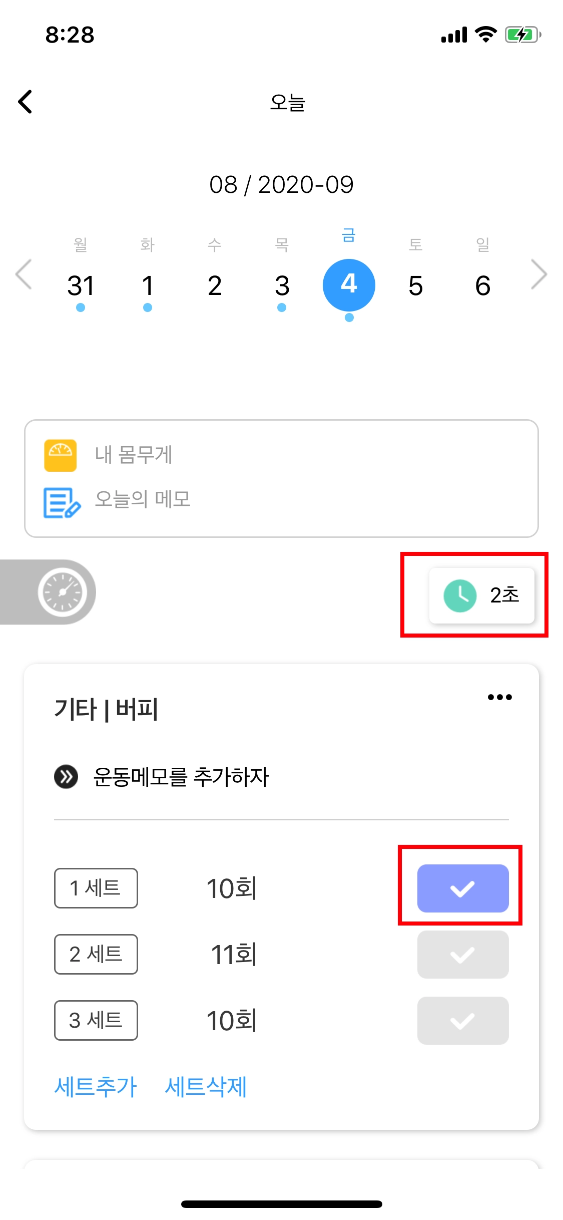 이제 수행중인 운동별로 메모를 작성할 수 있게 되었어요. 각각의 운동을 진행하며 기록해두고 싶은 부분을 이제 메모로 남겨요!
