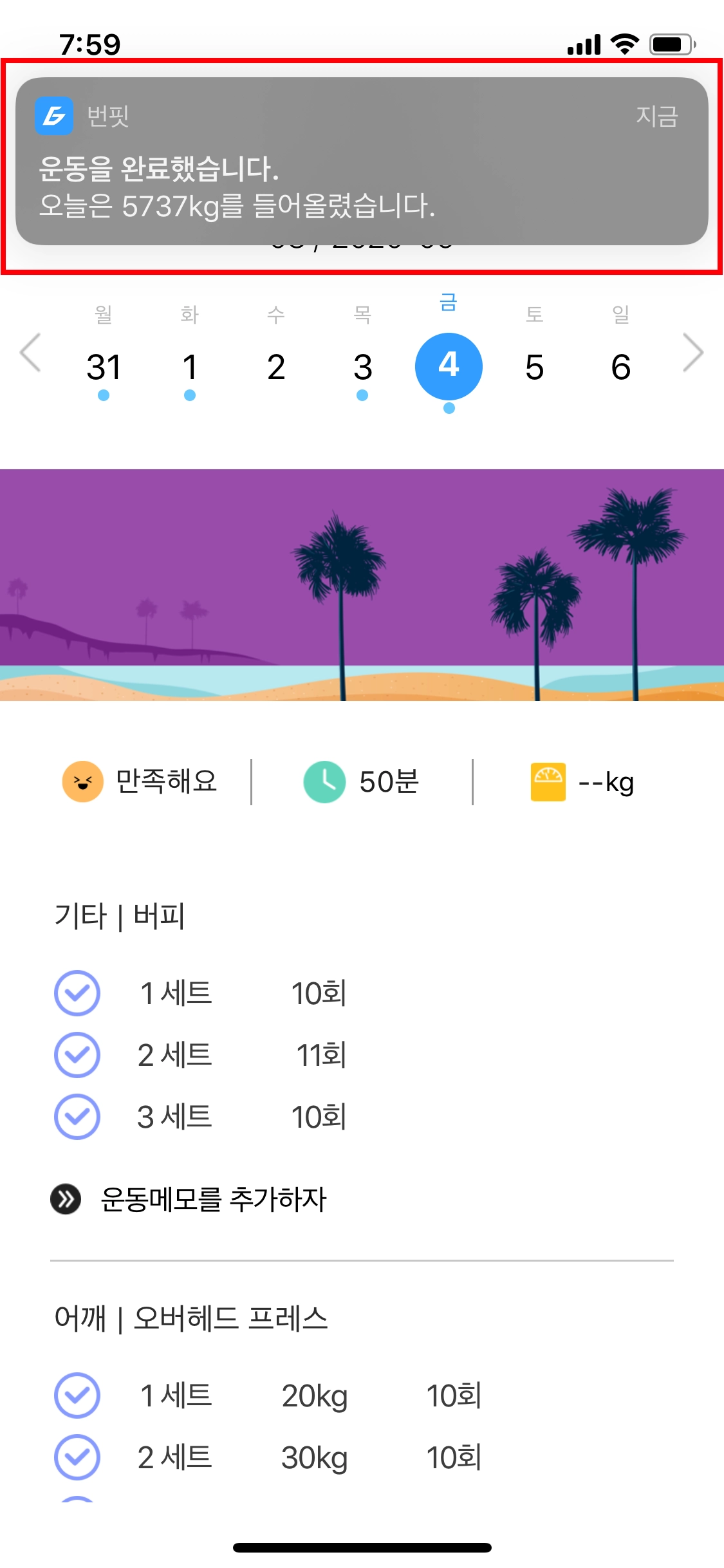 운동 기록이 완료되면, 상단 노티를 통해 총 볼륨 혹은 운동 시간을 알려줍니다.