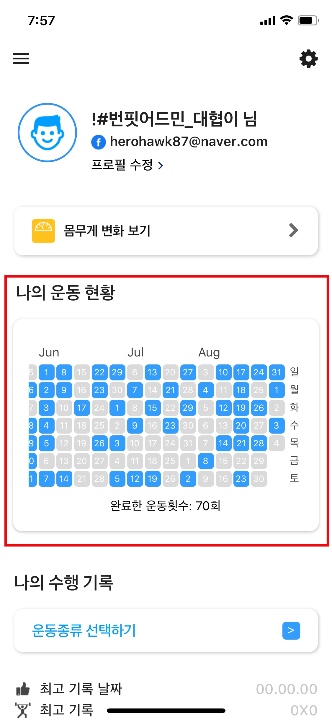 마이페이지에 "나의 운동 현황" 이 추가되었어요. 지금까지 운동을 수행한 날짜와, 각 부위별 운동 현황을 한눈에 알 수 있습니다.