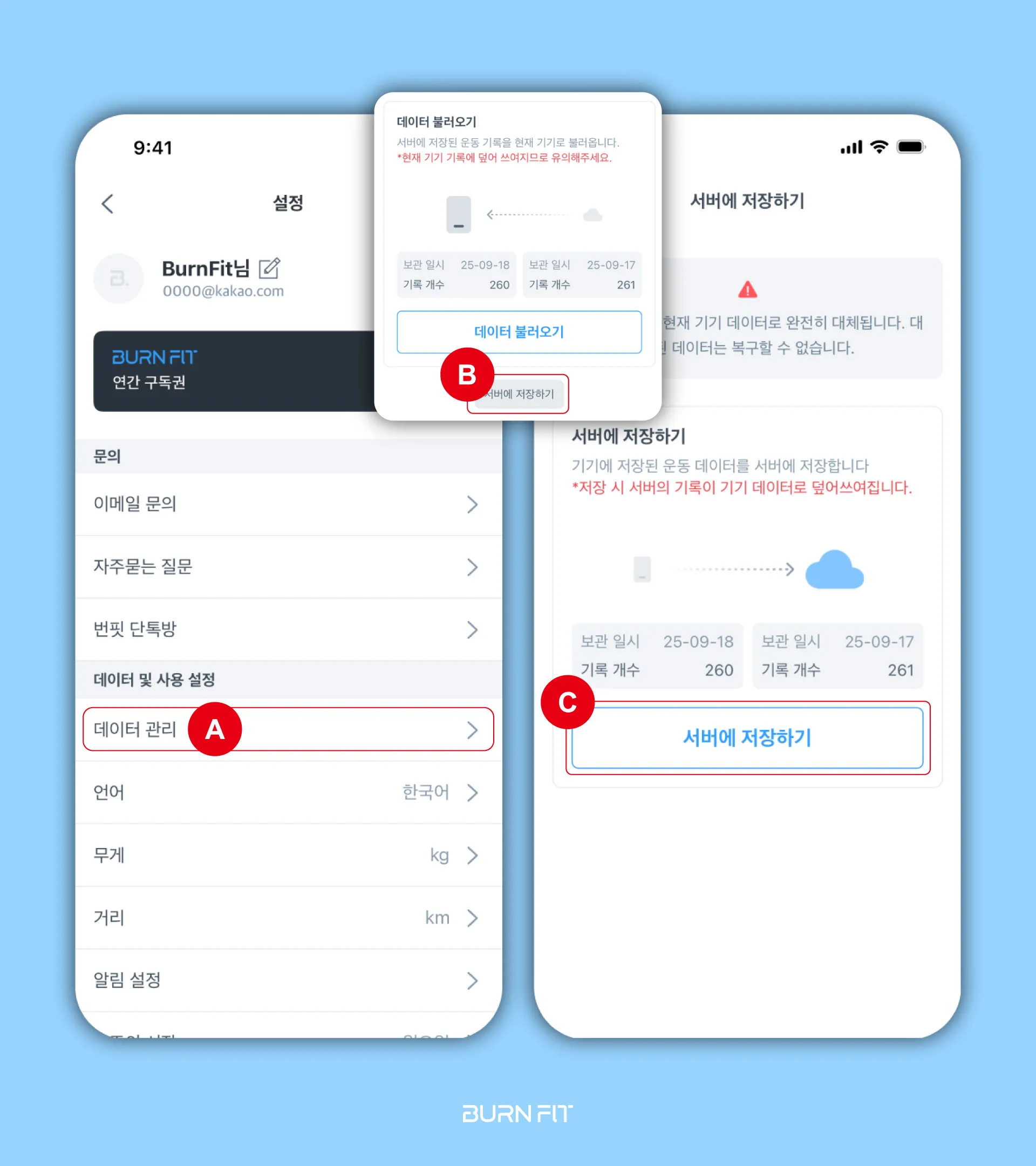 B/C. ‘서버에 저장하기’로 현재 기록 데이터를 저장합니다.