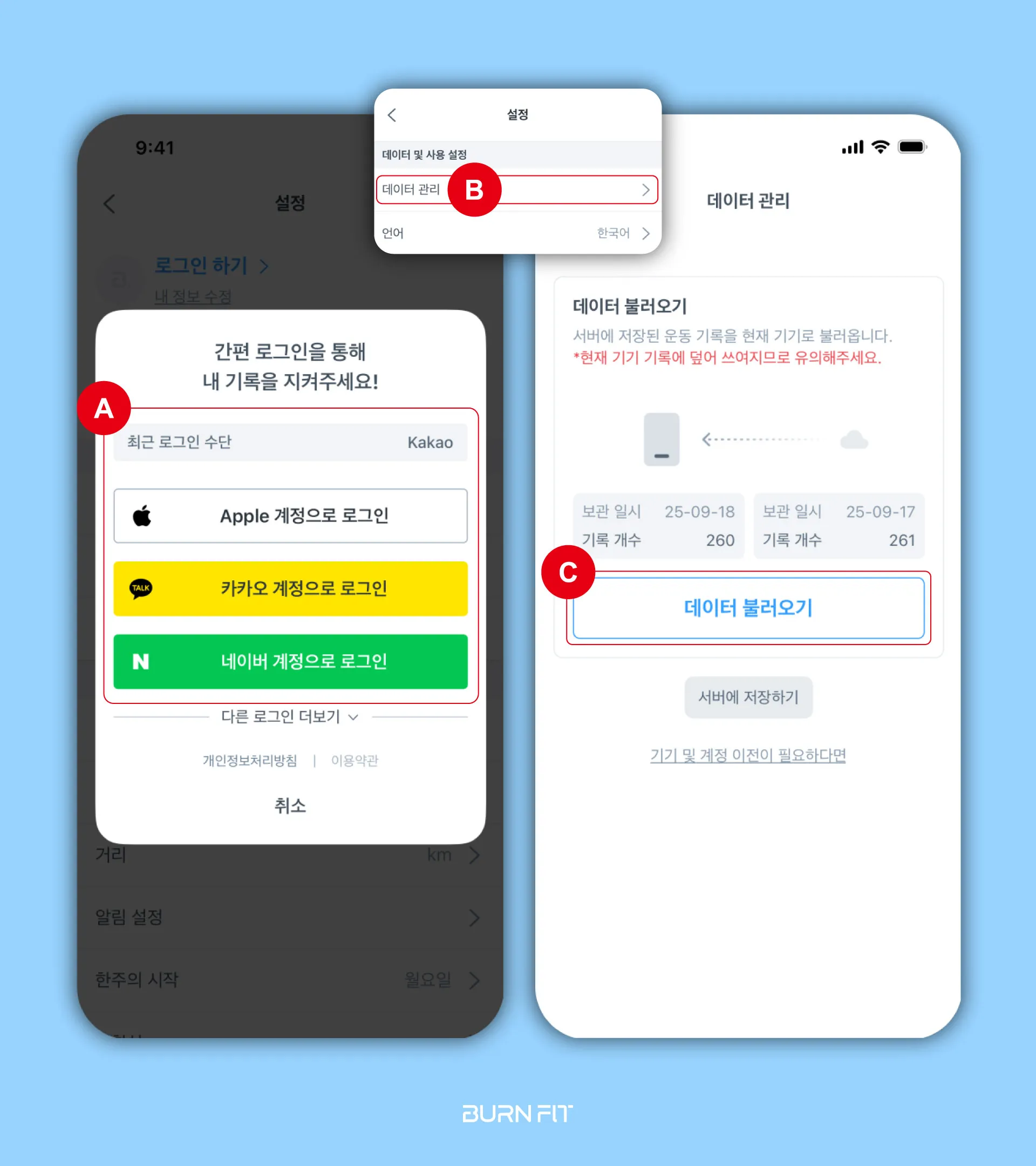 B/C. 서버에 저장된 데이터를 불러오기 합니다.