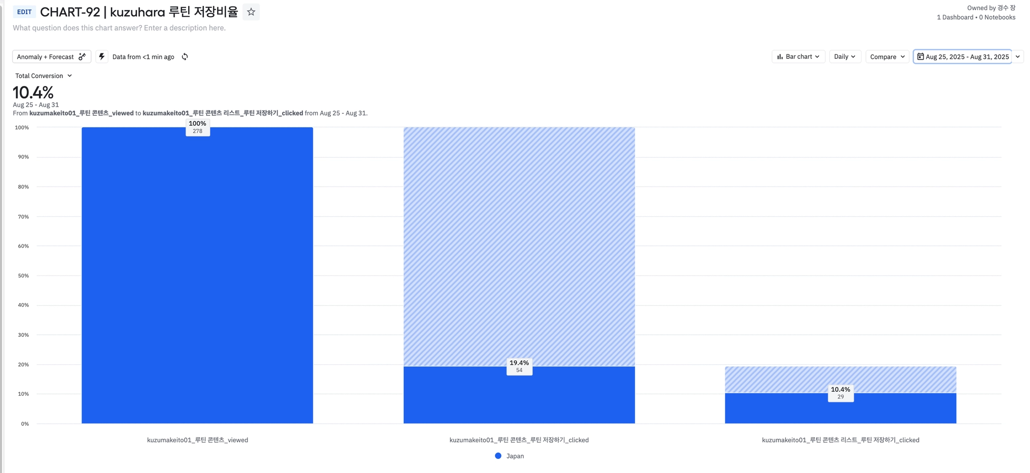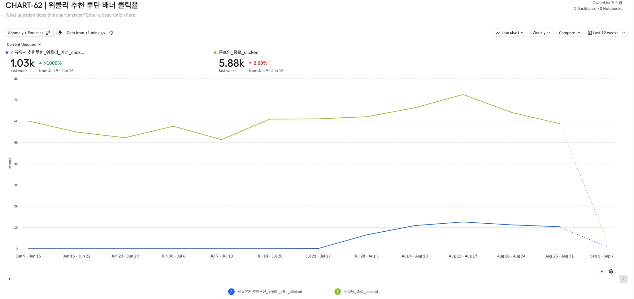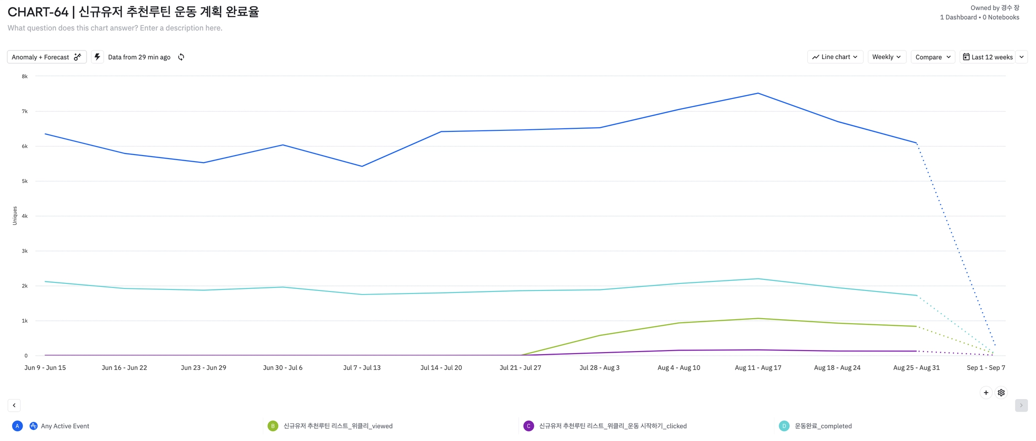 주간 온보딩 종료한 유저 수가 감소하면서 신규유저 추천루틴 배너 클릭율에도 영향을 주었다.