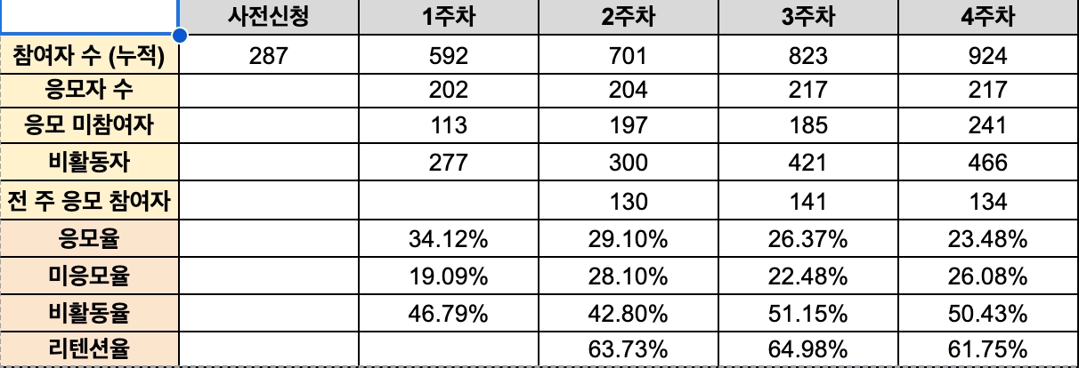 참여하기 CTA 클릭 | 1,898(68.4%) | 934(58.6%) | 303 (36.7%) |