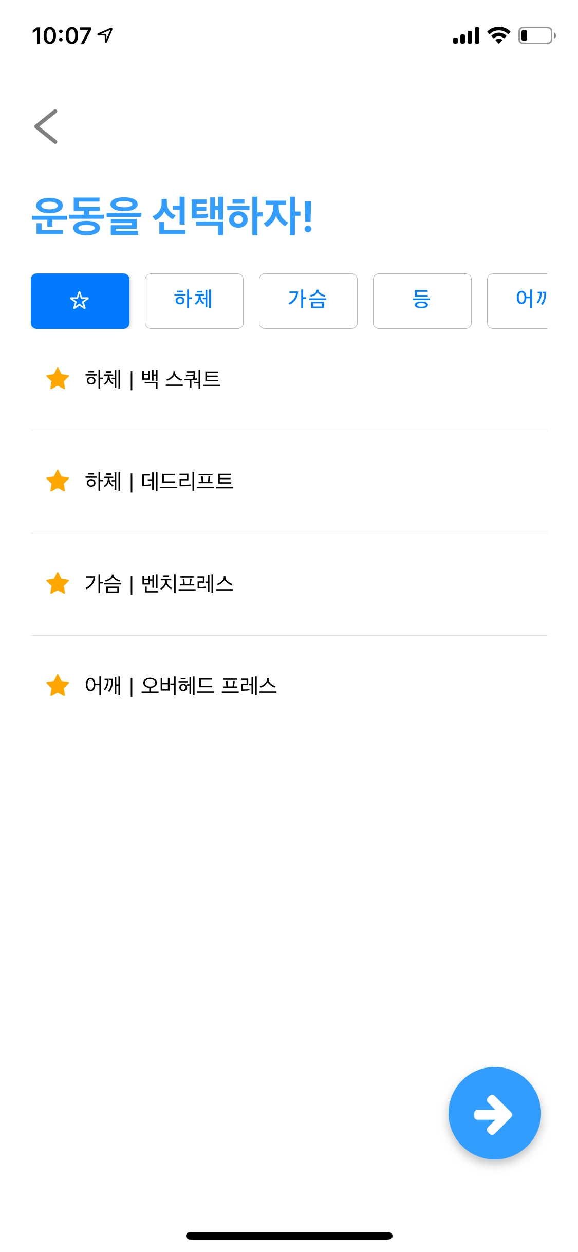 이제 운동 계획을 작성할때 원하는 운동을 즐겨찾기 해두면, 즐겨찾기 탭에서 편하게 운동을 선택할 수 있습니다.