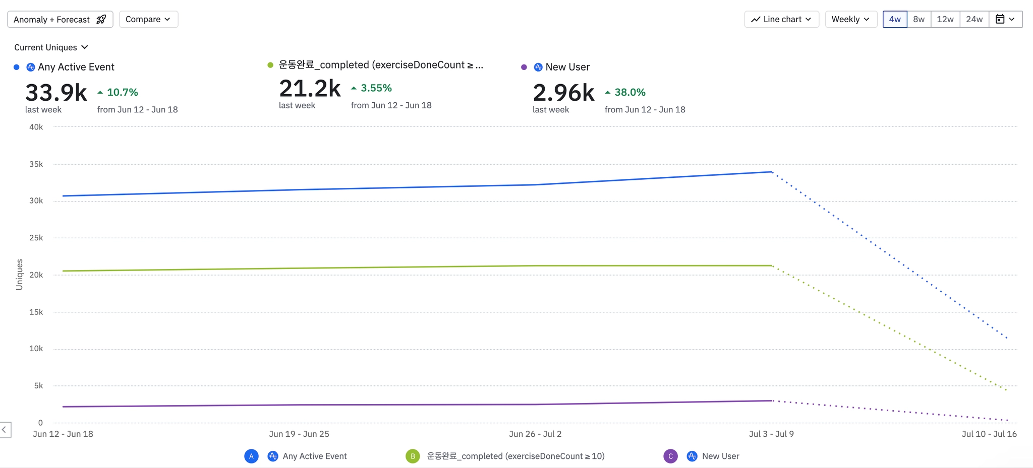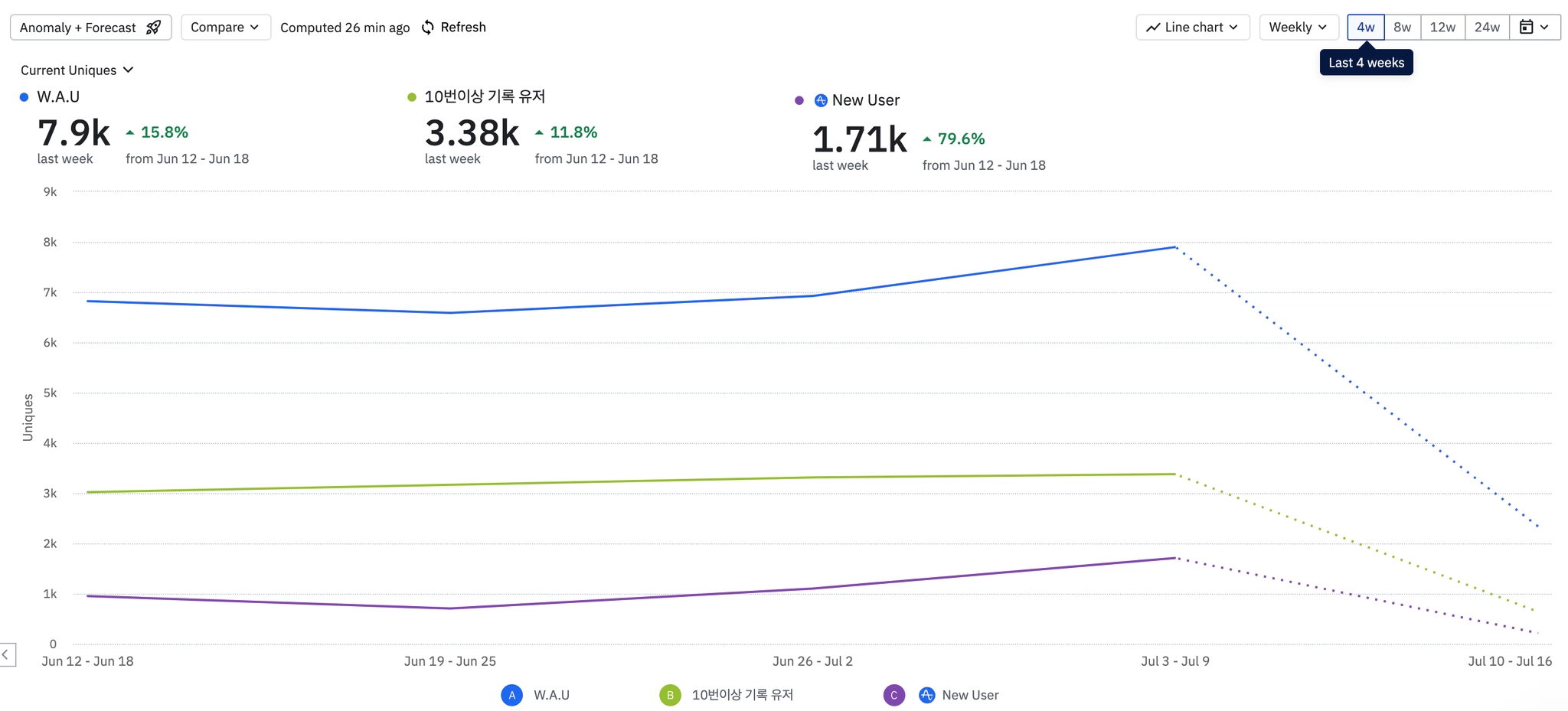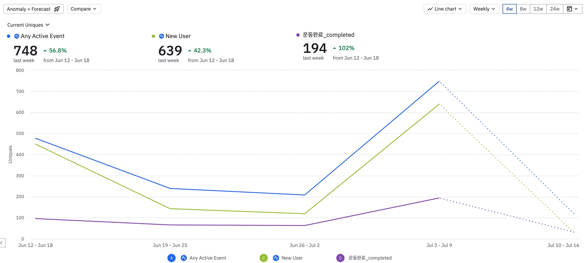 amplitude기준 WAU 700명이지만 아직 1주차 리텐션이 18% 수준으로 타겟 유저 모객에 집중해야하는 시점입니다.