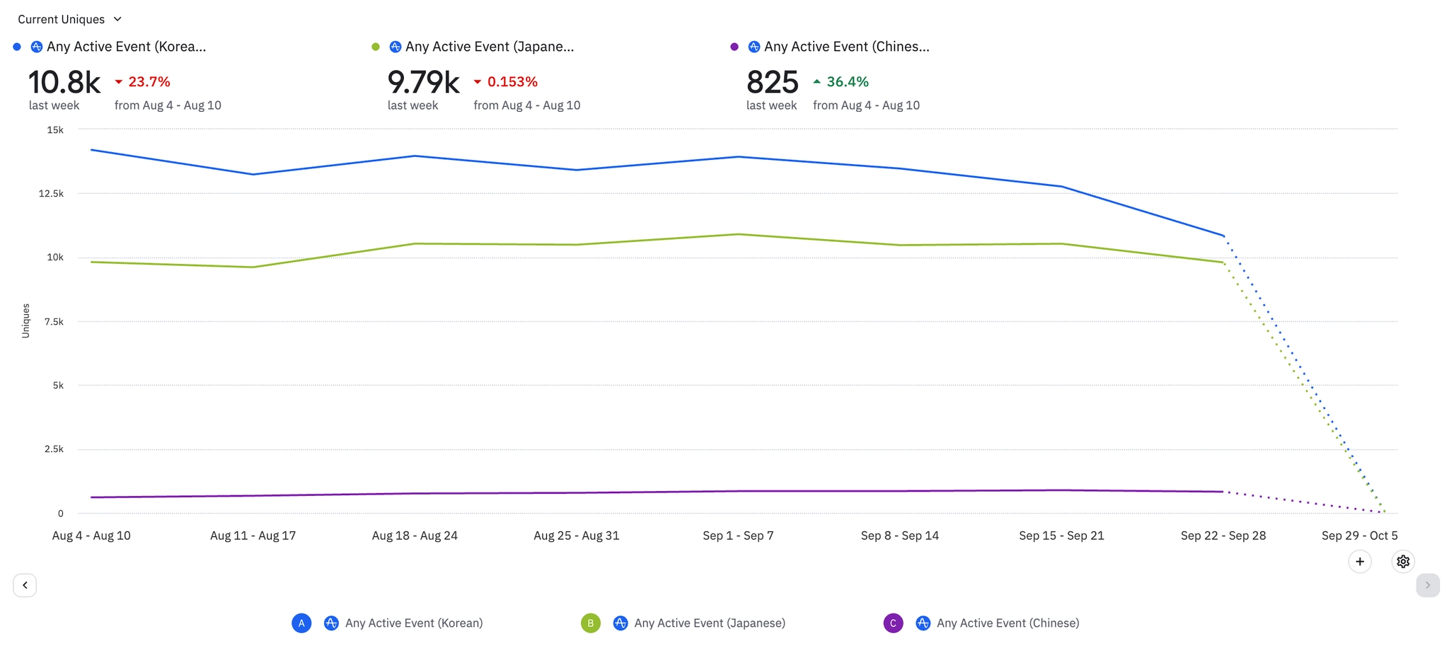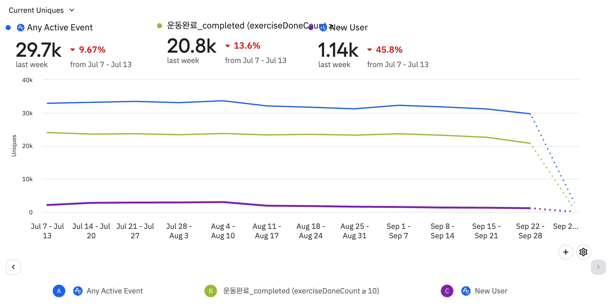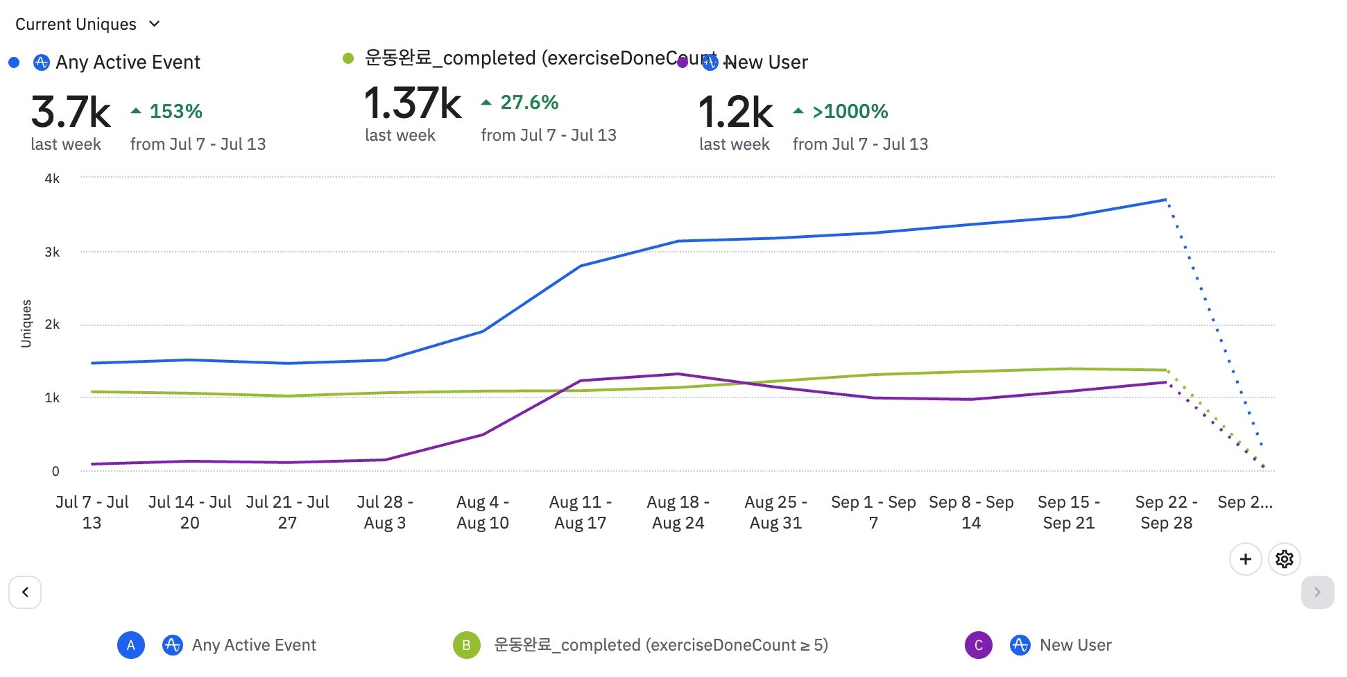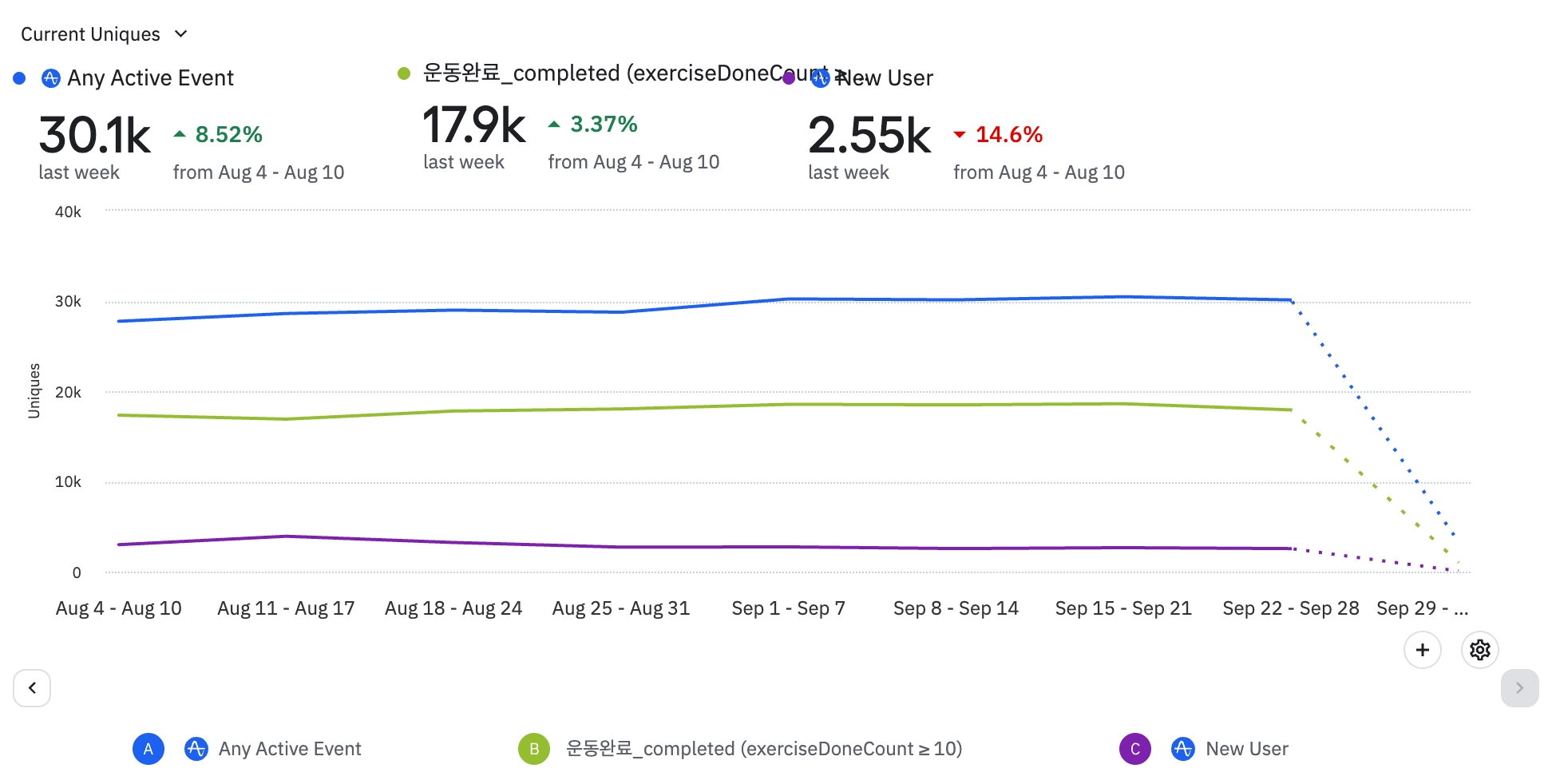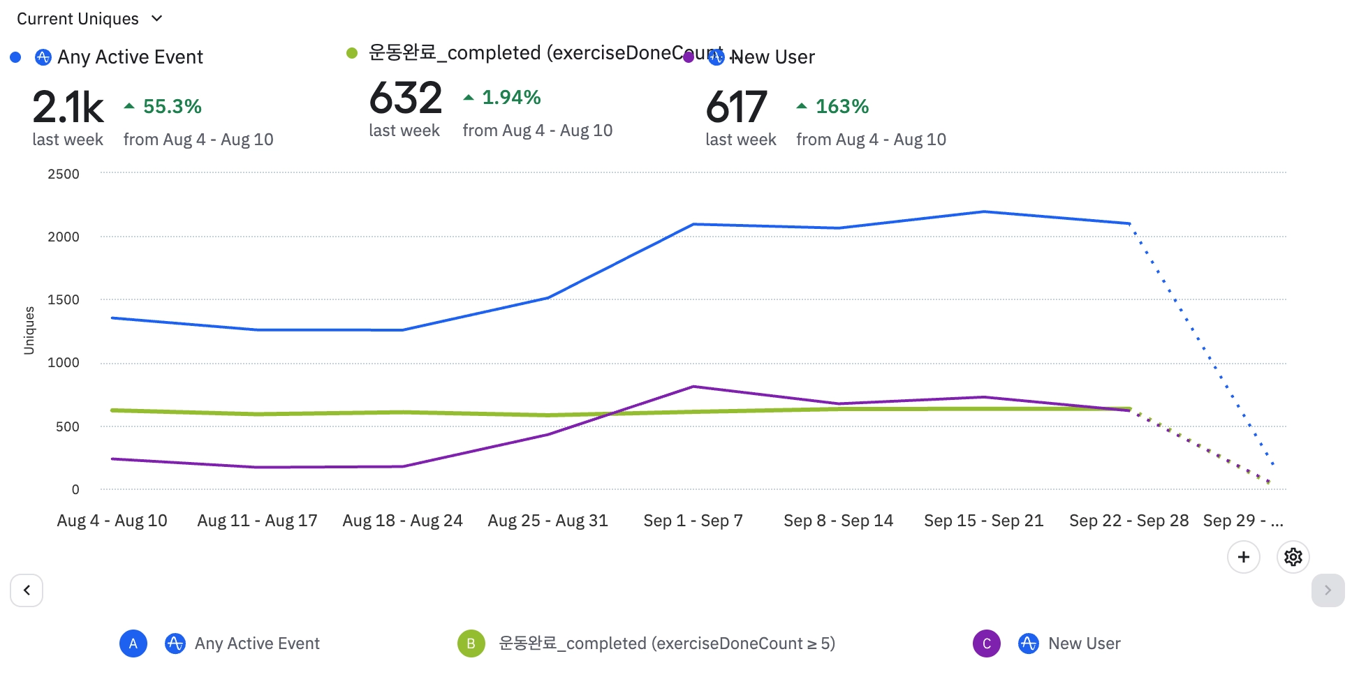 분석 탭 클릭 or 위클리 내 배너 클릭으로의 전환수는 첫 주 79명/전환율 1.42%