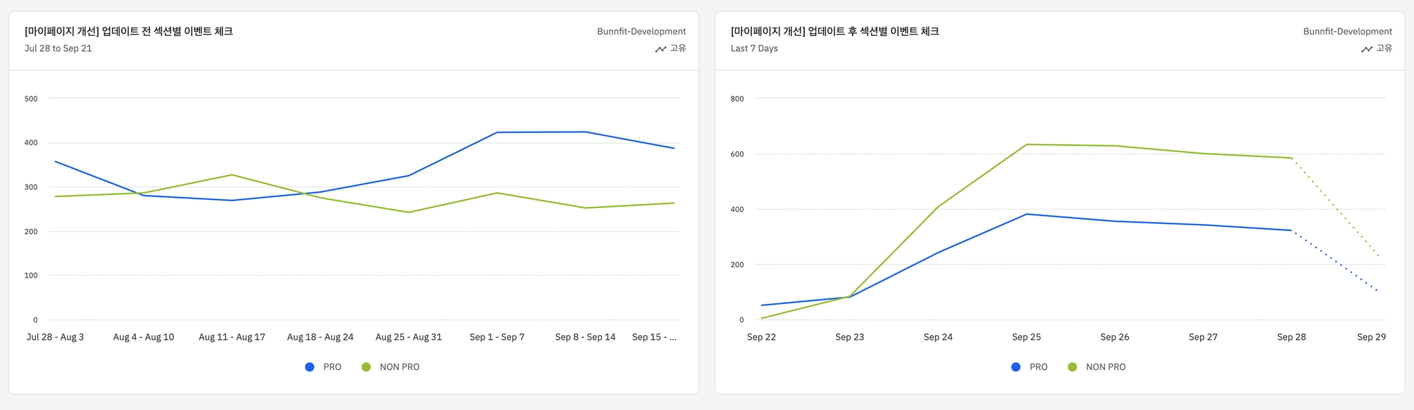 업데이트 전, 후/프로, 논프로 이벤트 비교