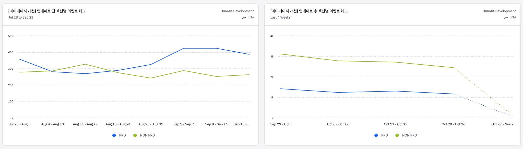 업데이트 전, 후/프로, 논프로 이벤트 비교