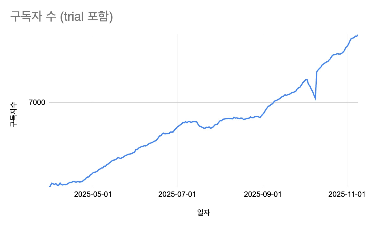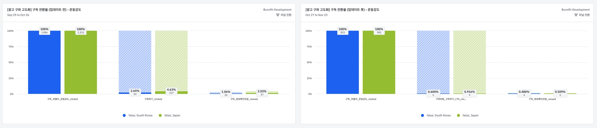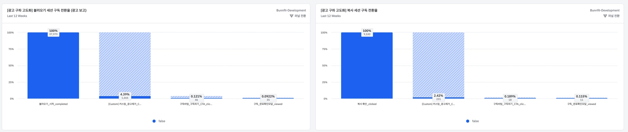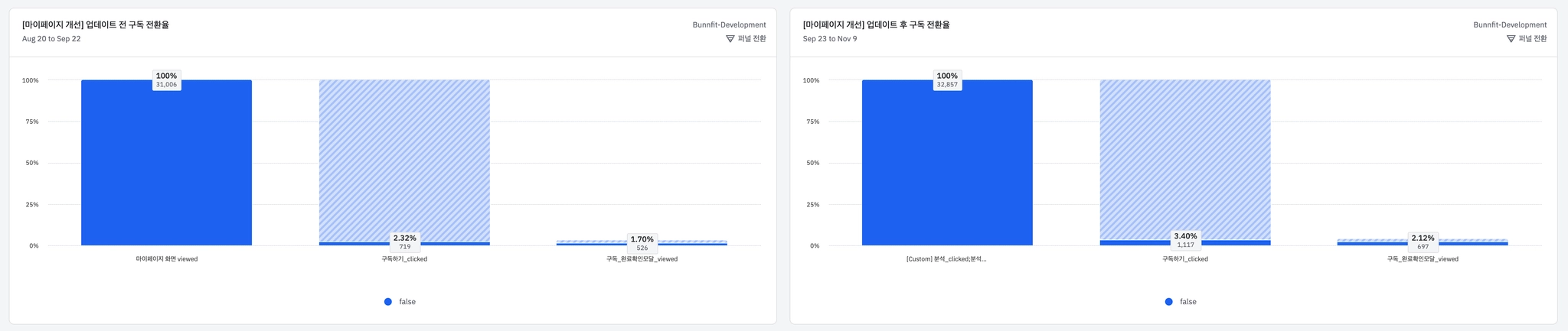 이전보다 전환율이 현저히 낮은 것으로 보아 구독 타이밍의 문제보단 구독 페이지 자체 이슈가 아닐지 생각