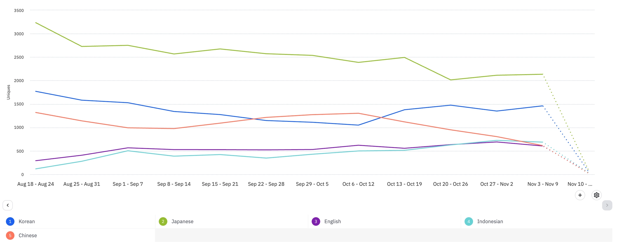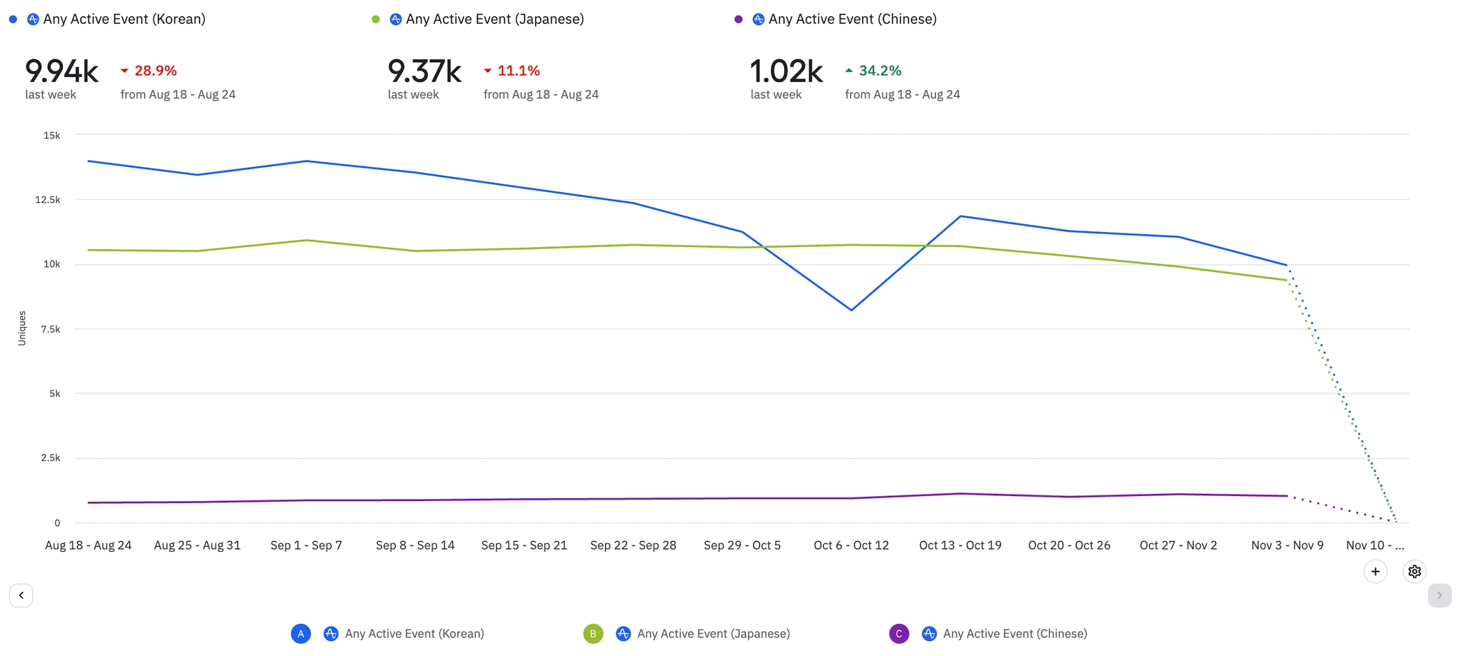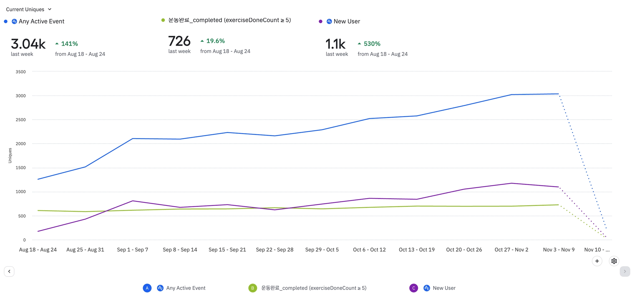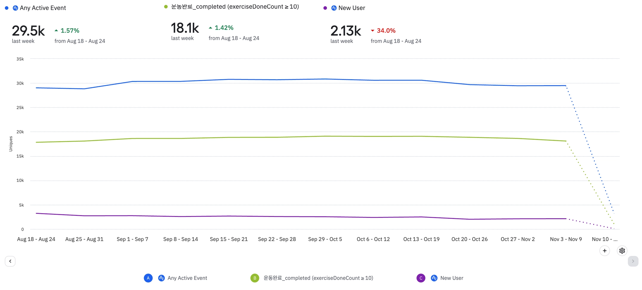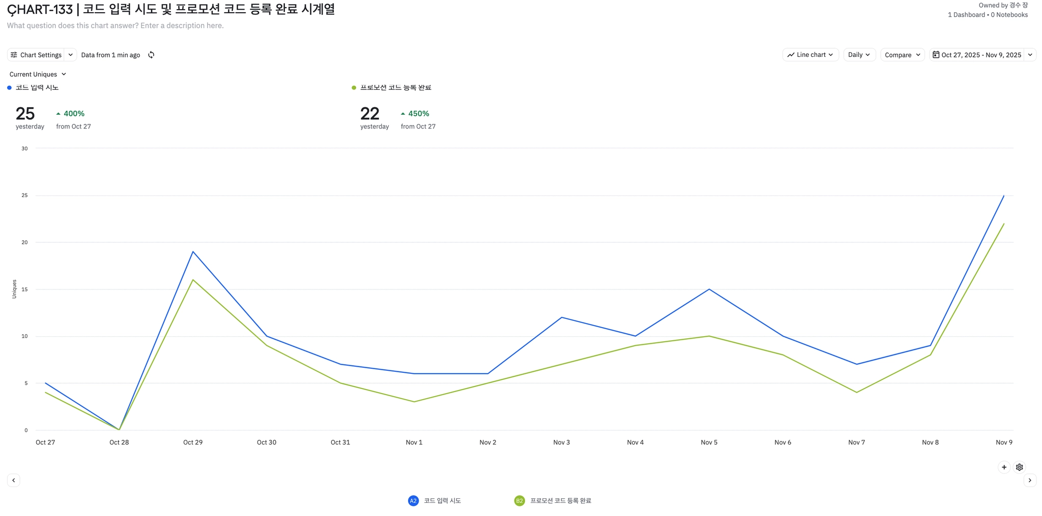10월 27일(업데이트)부터 11월 9일까지(14일간) 친구 초대코드 등록 및 PRO 완료된 유저의 모수 자체가 많지는 않지만 상승 중에 있다.