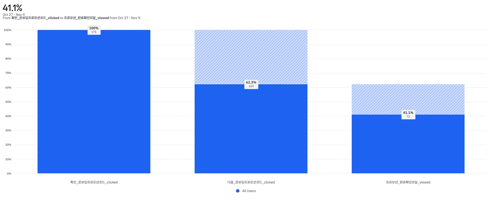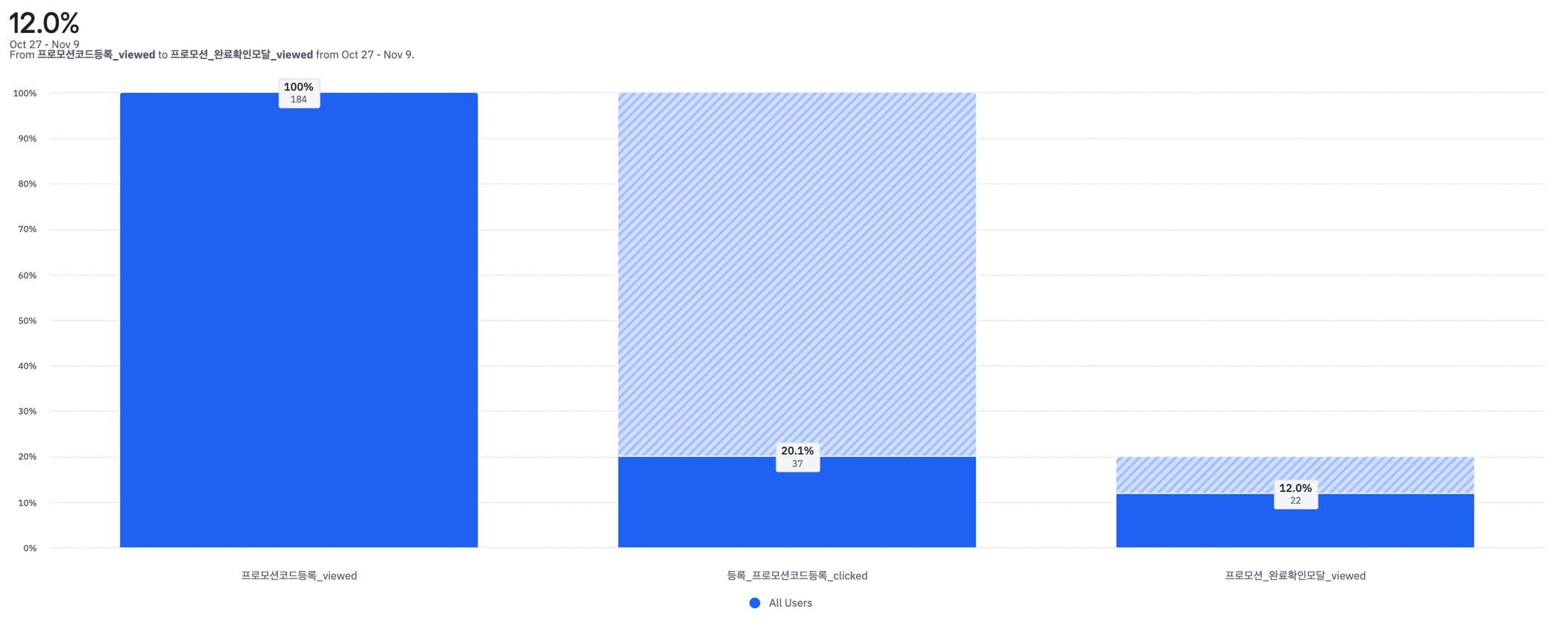 10월 27일(업데이트)부터 11월 9일까지(14일간) 친구 초대하기 페이지에 유입된 1,156명이 초대코드 복사 또는 공유하기 액션을 142(12.3%)회 완료했다.