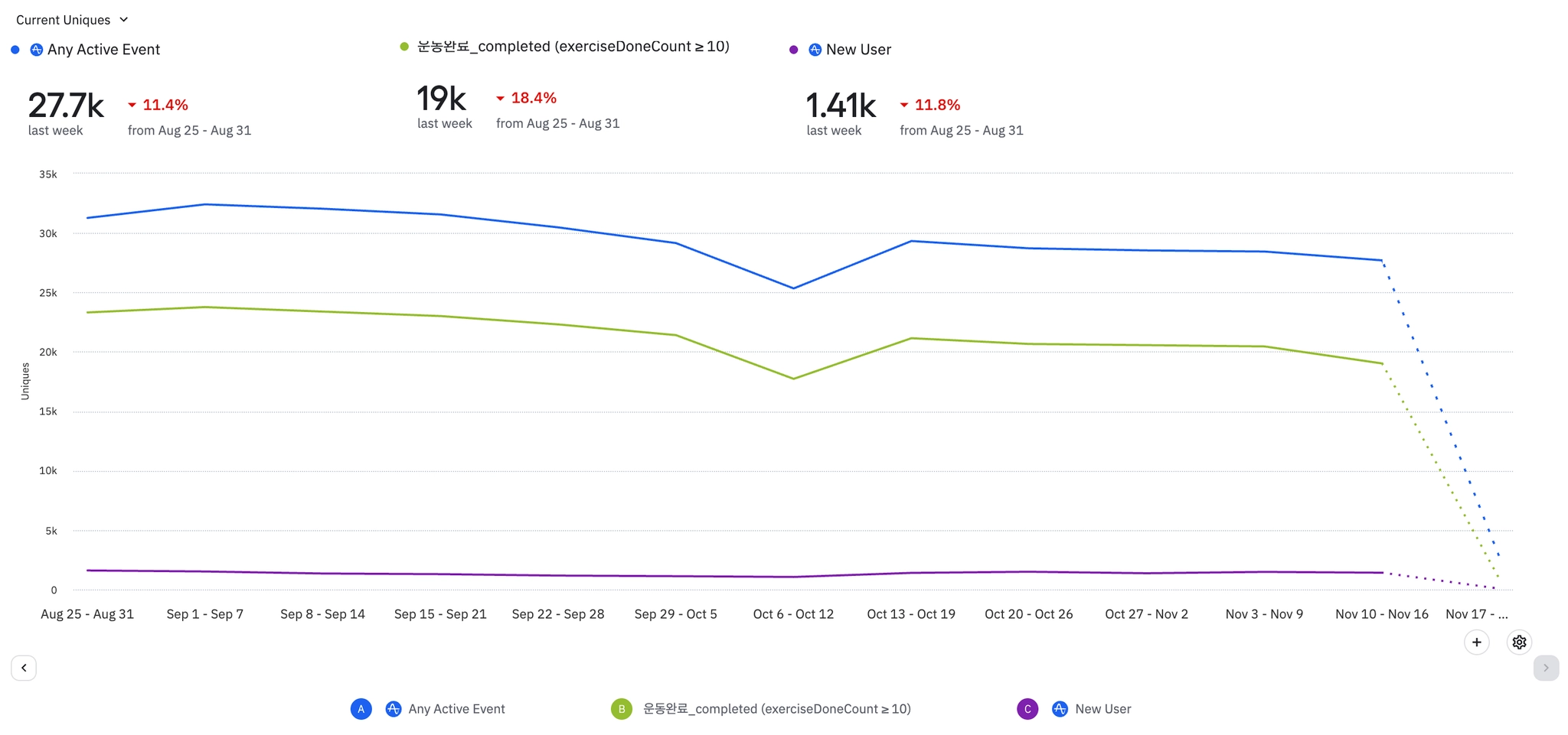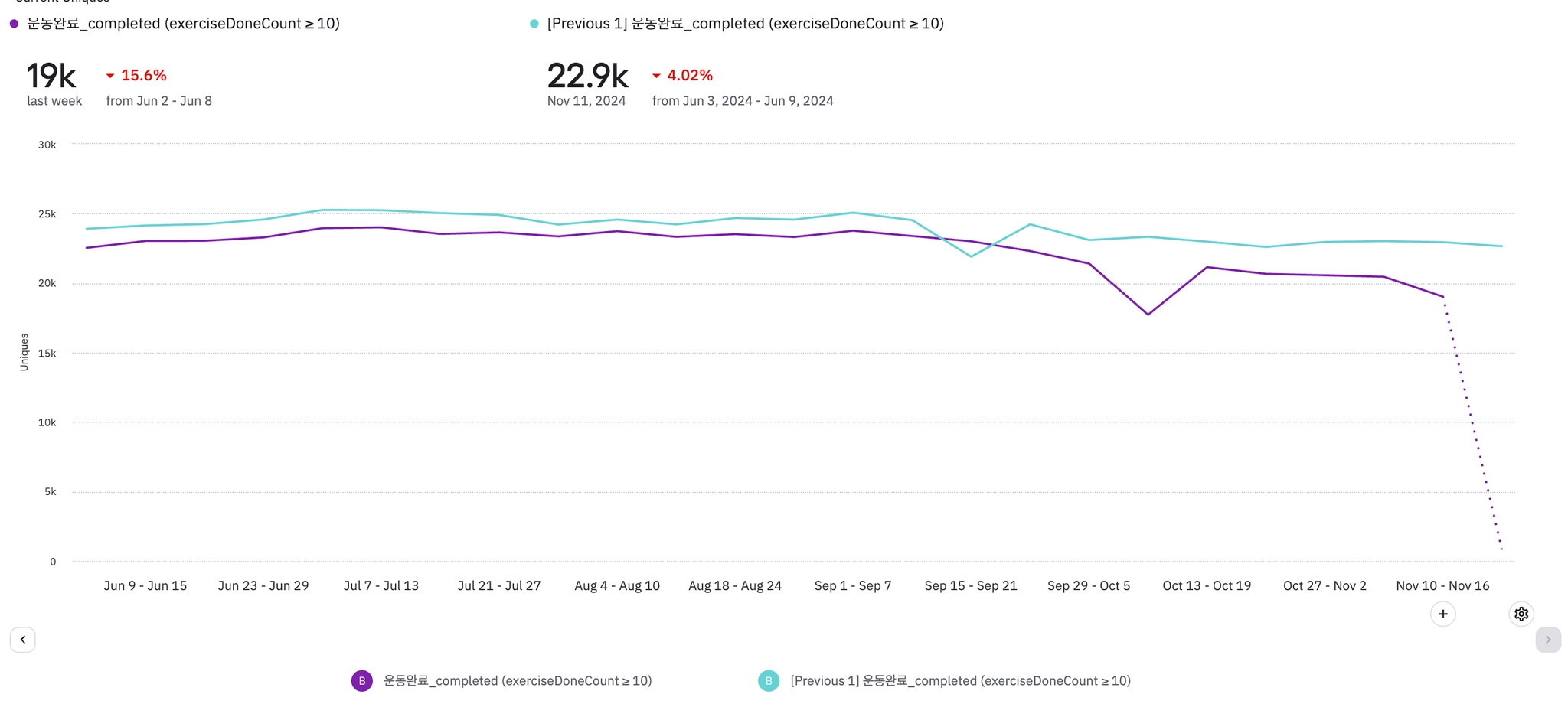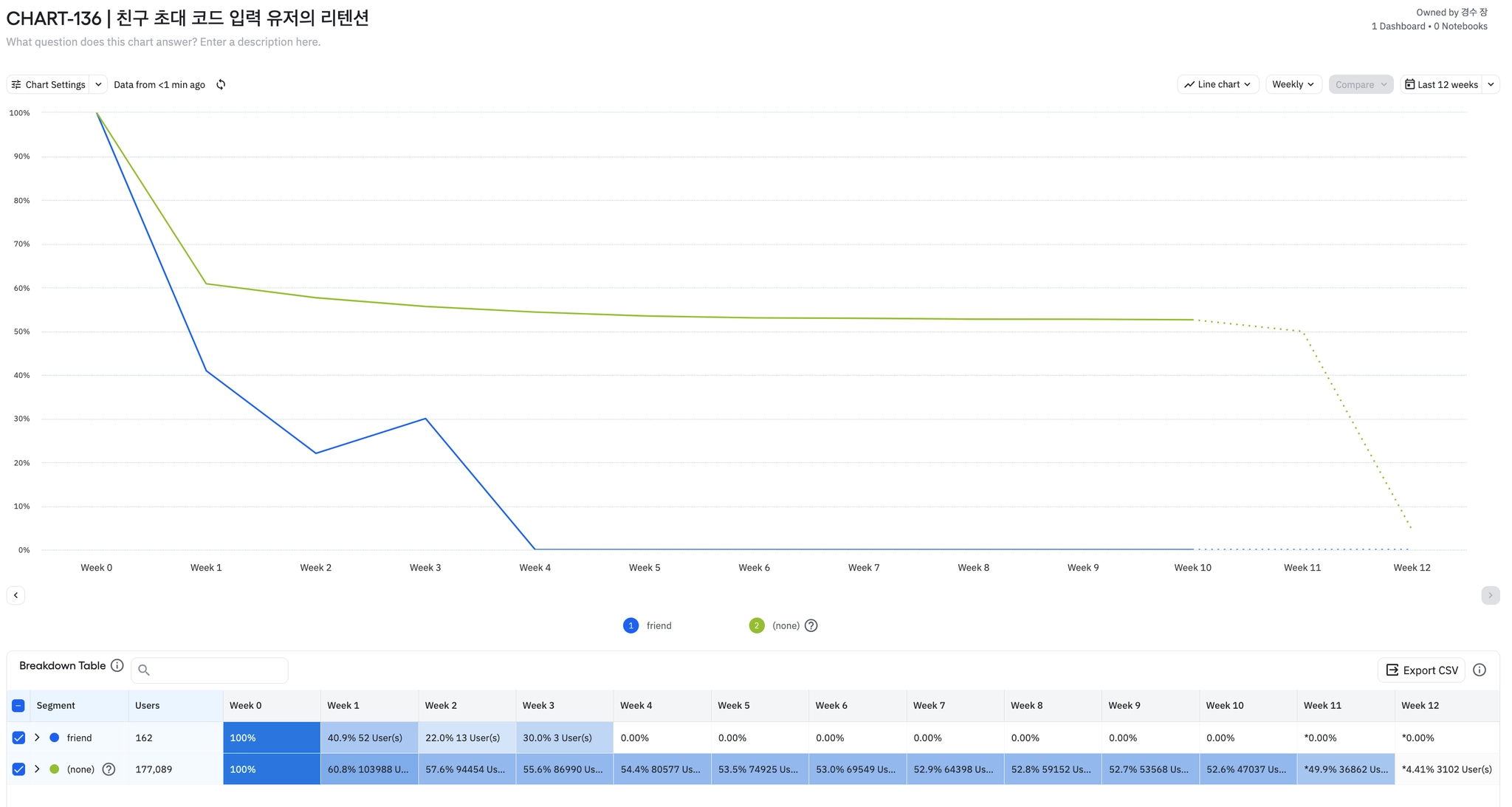 10월 27일(업데이트) 이후 프로모션코드 등록 유저의 최근 12주 주간 리텐션 지표