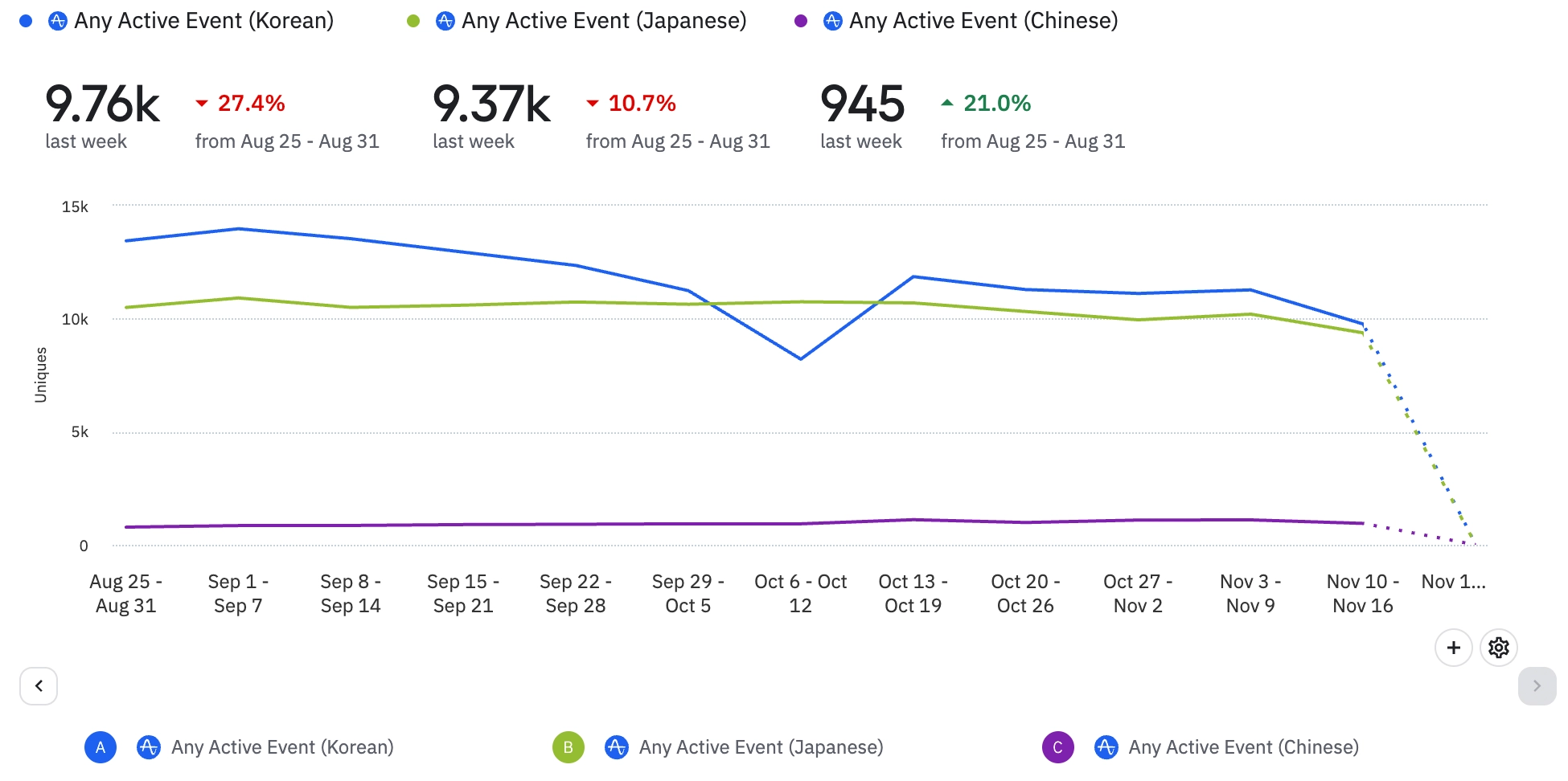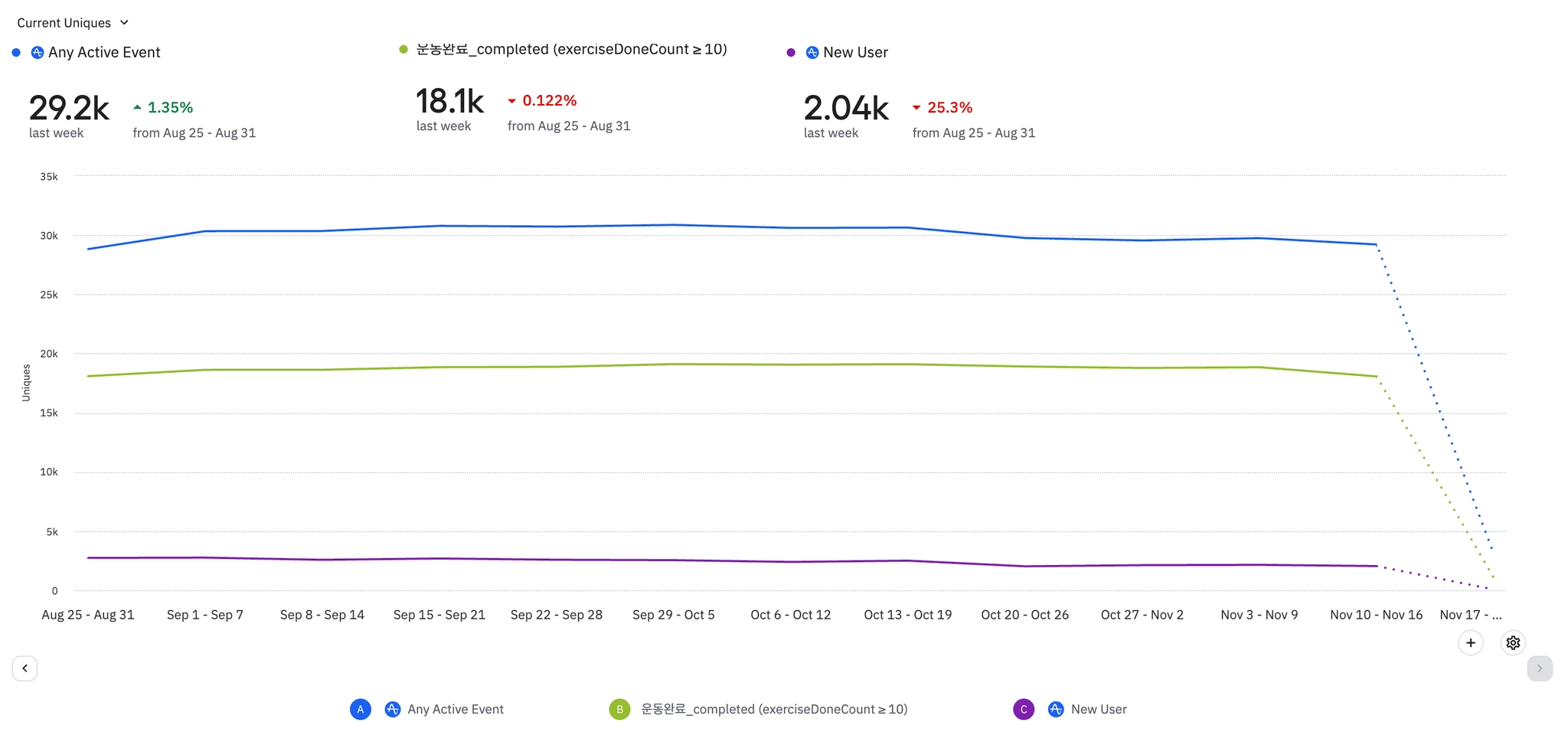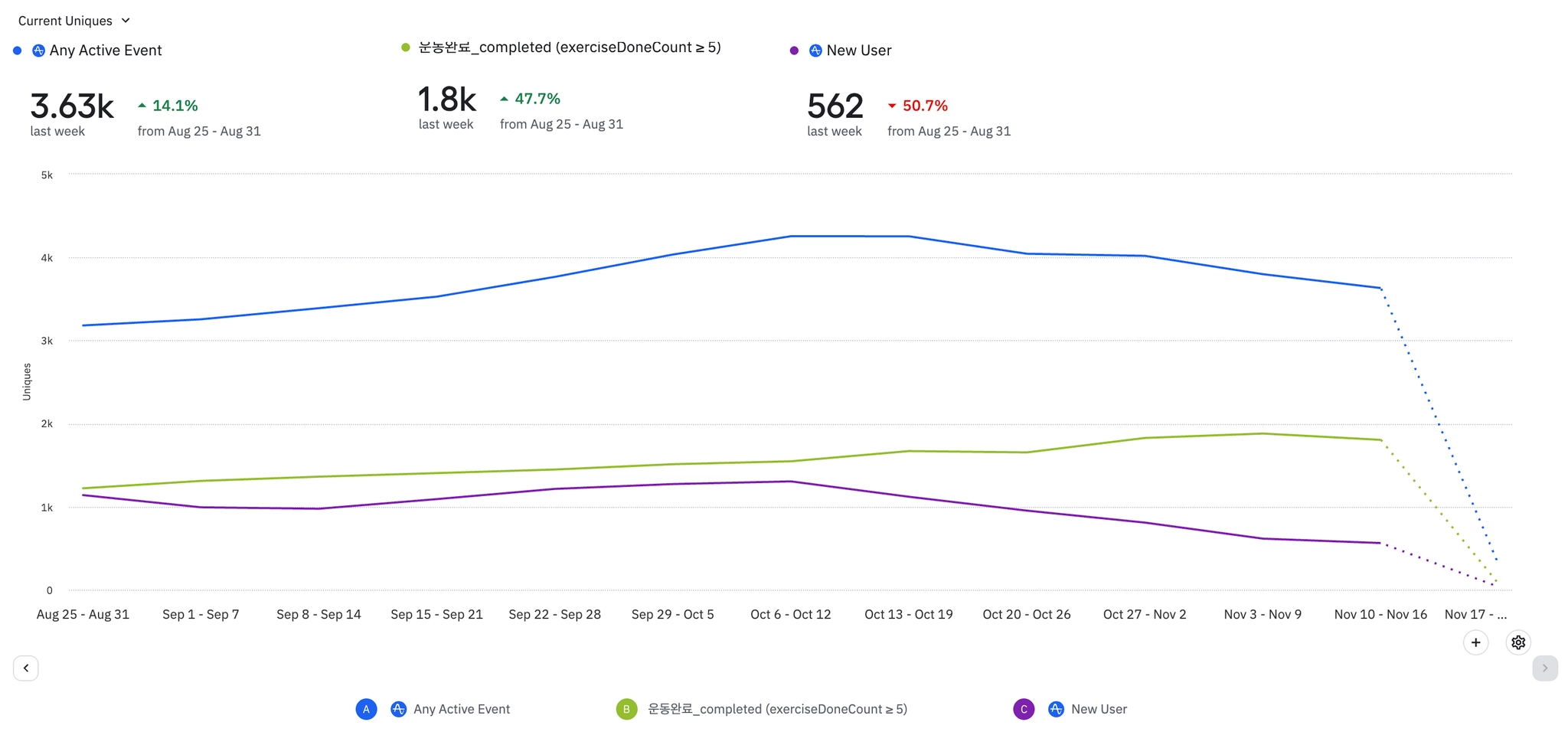 10월 27일(업데이트) 이후 프로모션코드 등록 유저의 최근 12주 주간 리텐션 지표