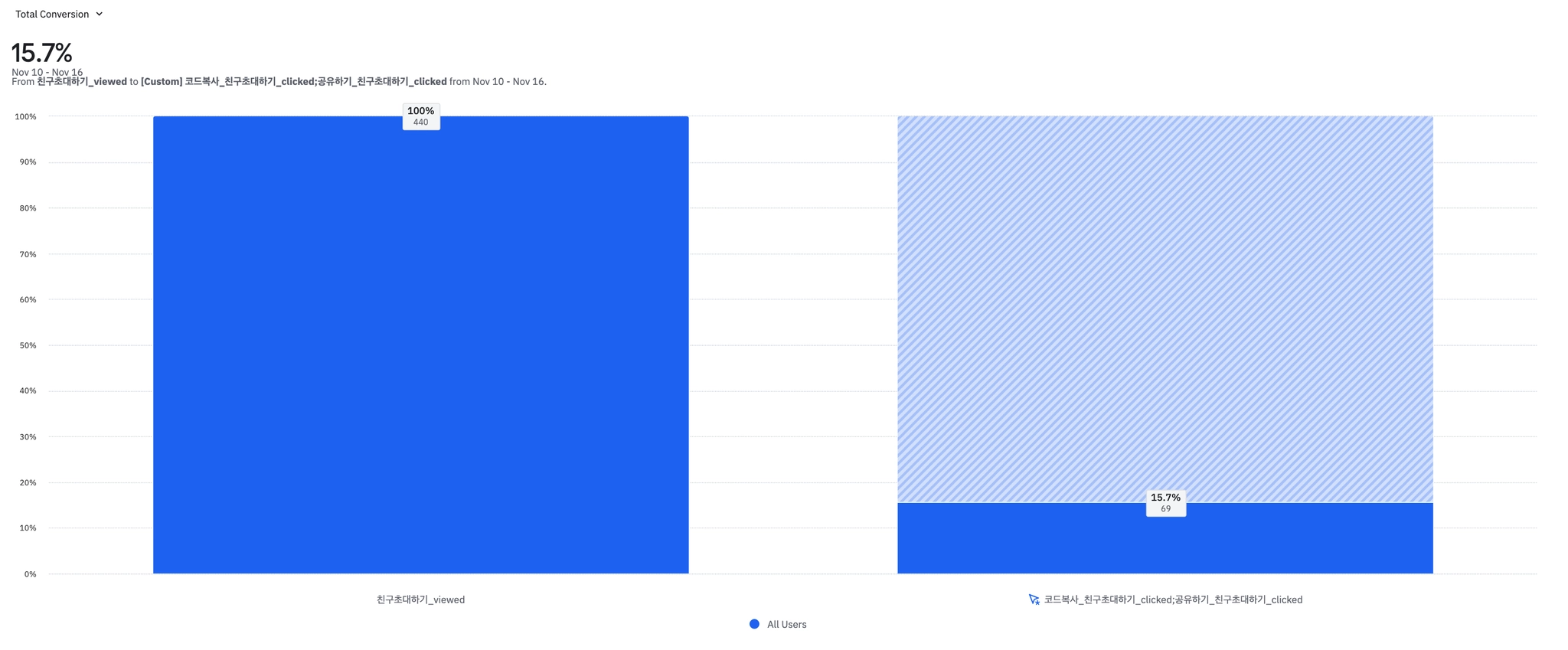 10월 27일(업데이트) 이후친구 초대하기 페이지에 유입된 1,156명이 초대코드 복사 또는 공유하기 액션 완료 비율