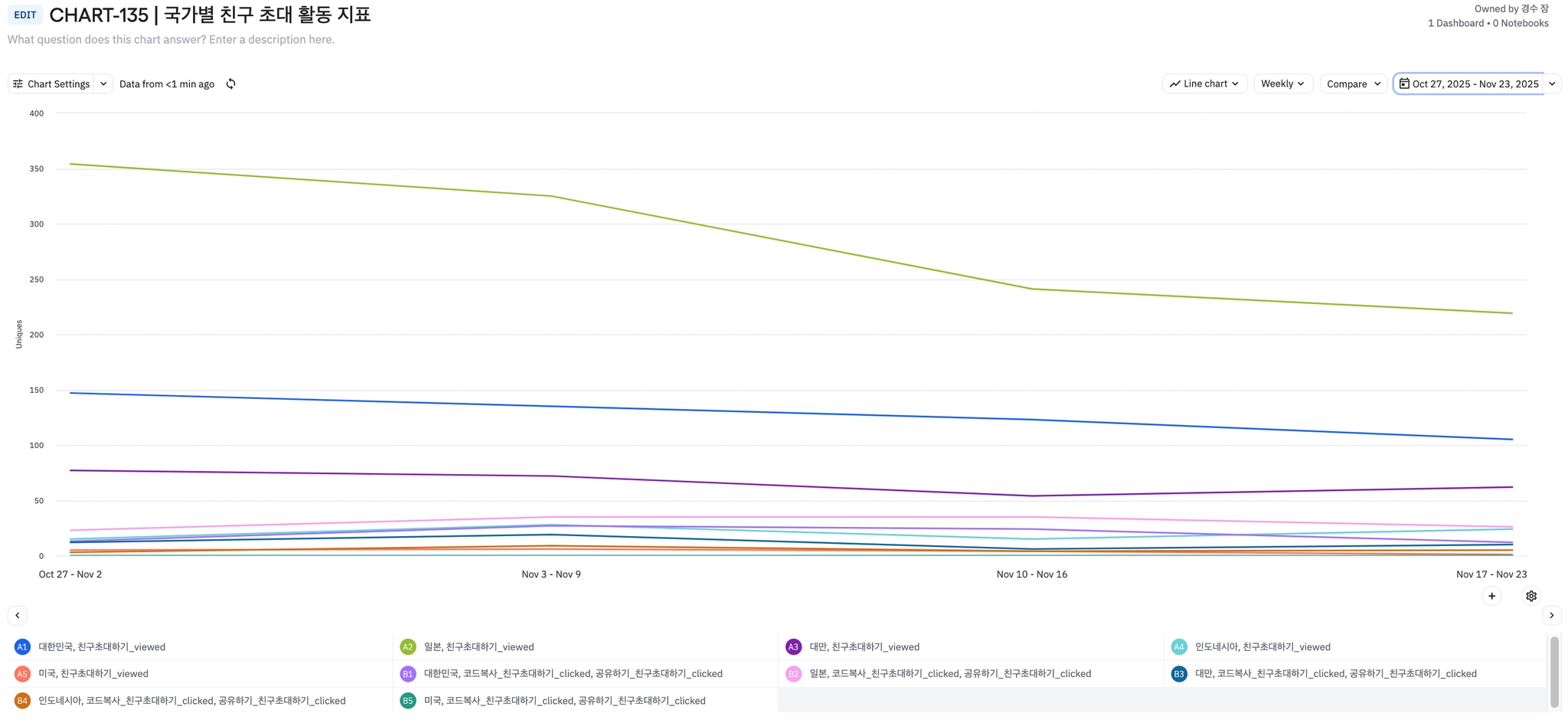 10월 27일(업데이트) 이후 국가별 친구 초대하기 페이지에 유입된 1,156명이 초대코드 복사 또는 공유하기 액션 활동 지표