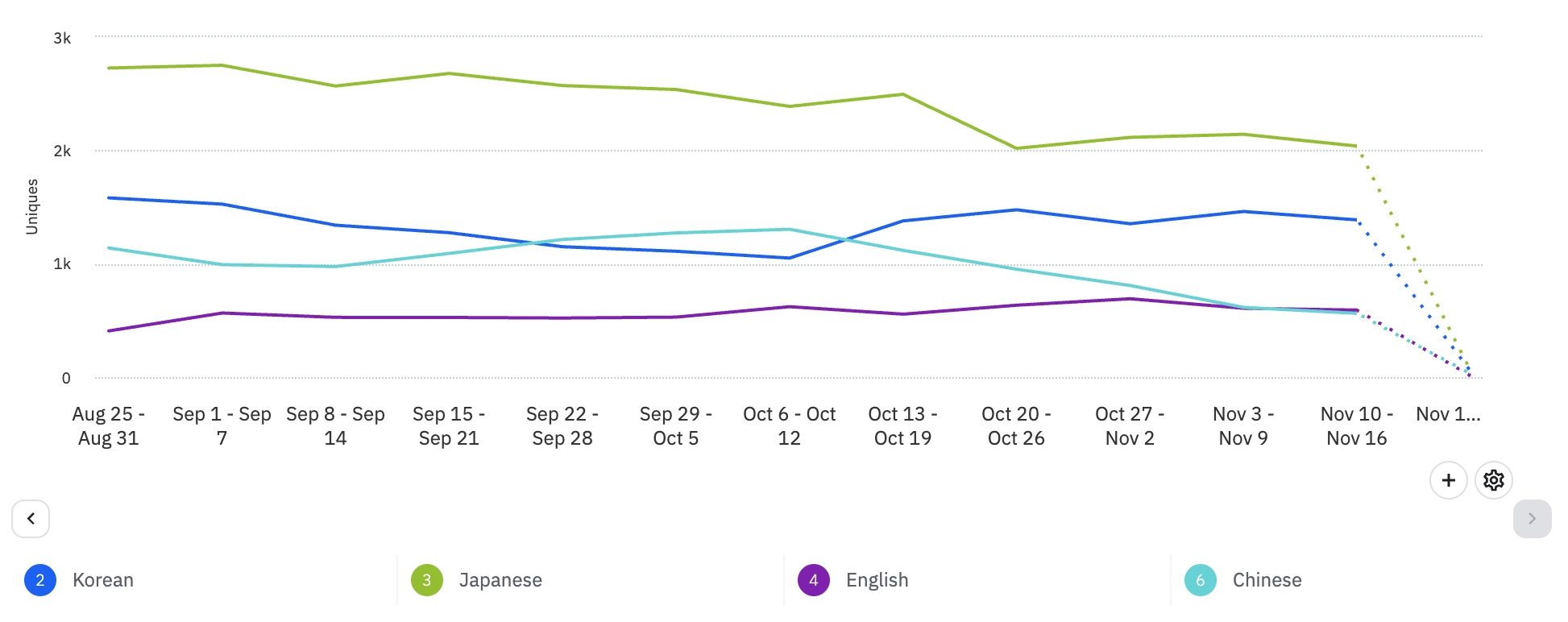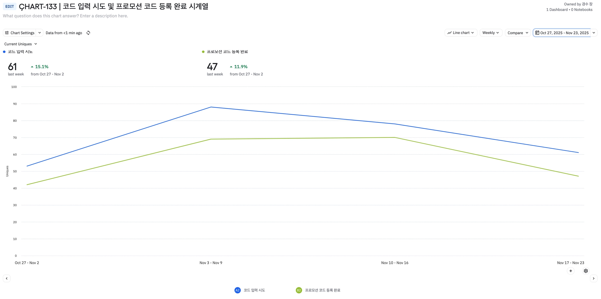 10월 27일(업데이트) 이후 프로모션코드 등록 시도 및 PRO 상태 전환 완료된 유저 (주간)