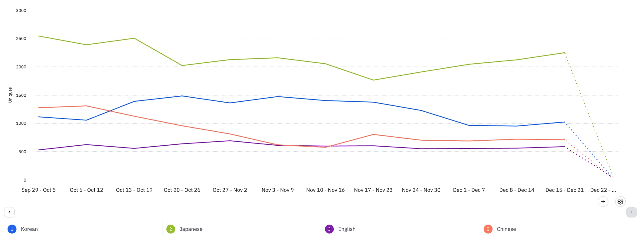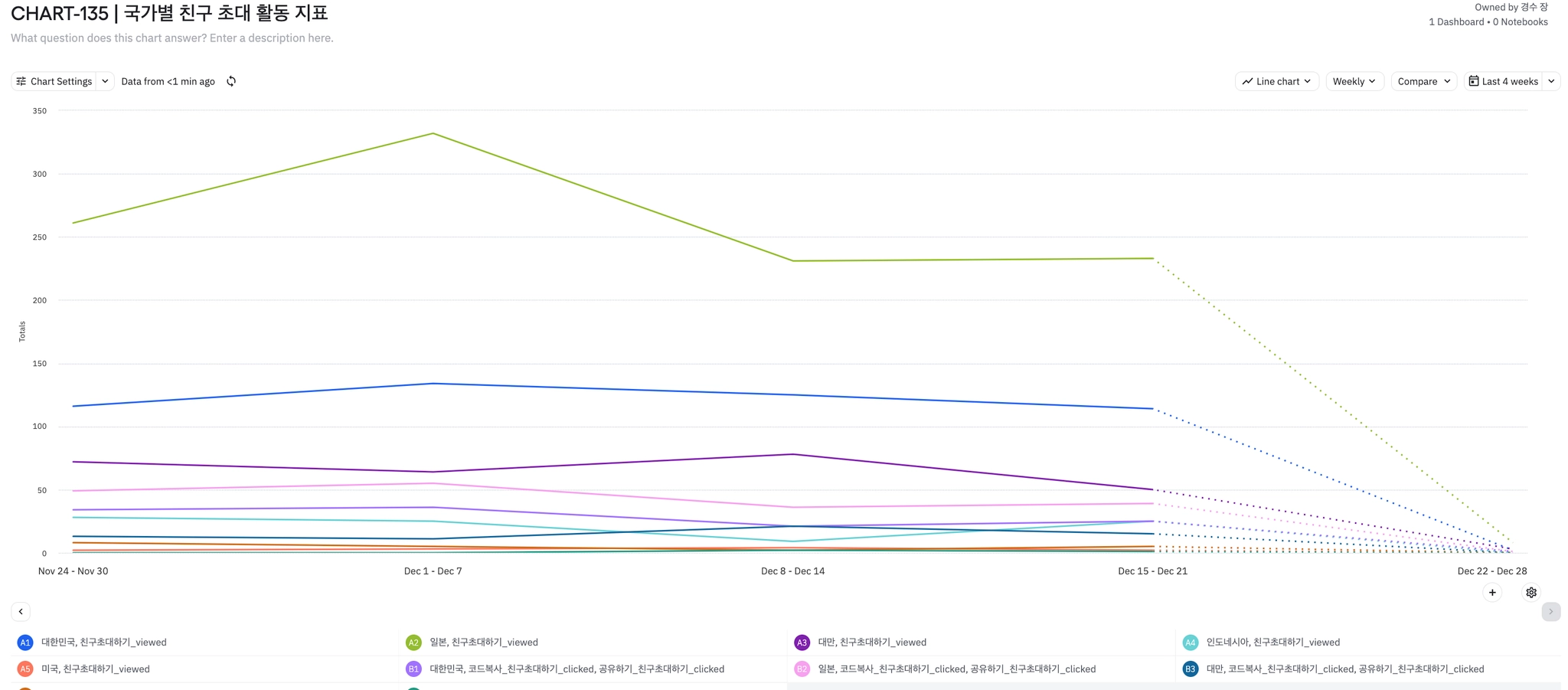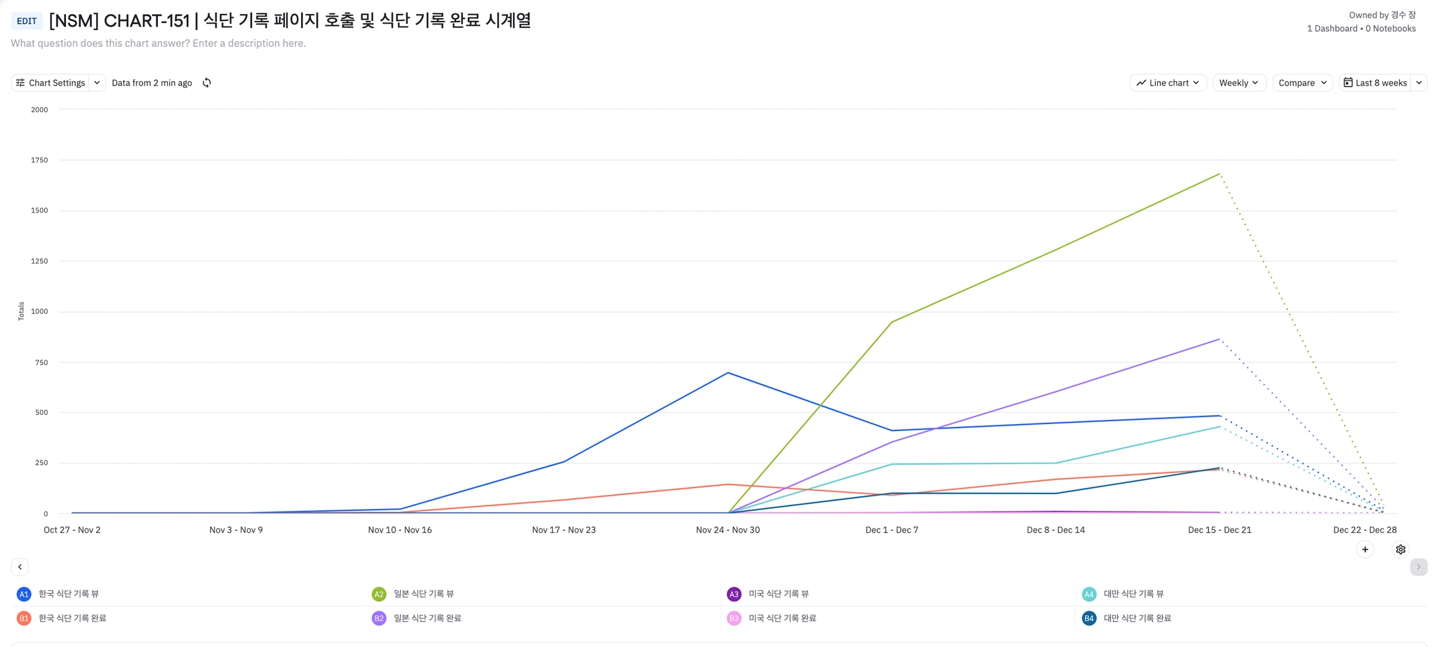 국가별로 일본, 한국, 대만, 미국 순으로 사용량이 많고 전주 대비 일본 및 대만 유저의 식단 기록 사용량이 꽤 증가했다.