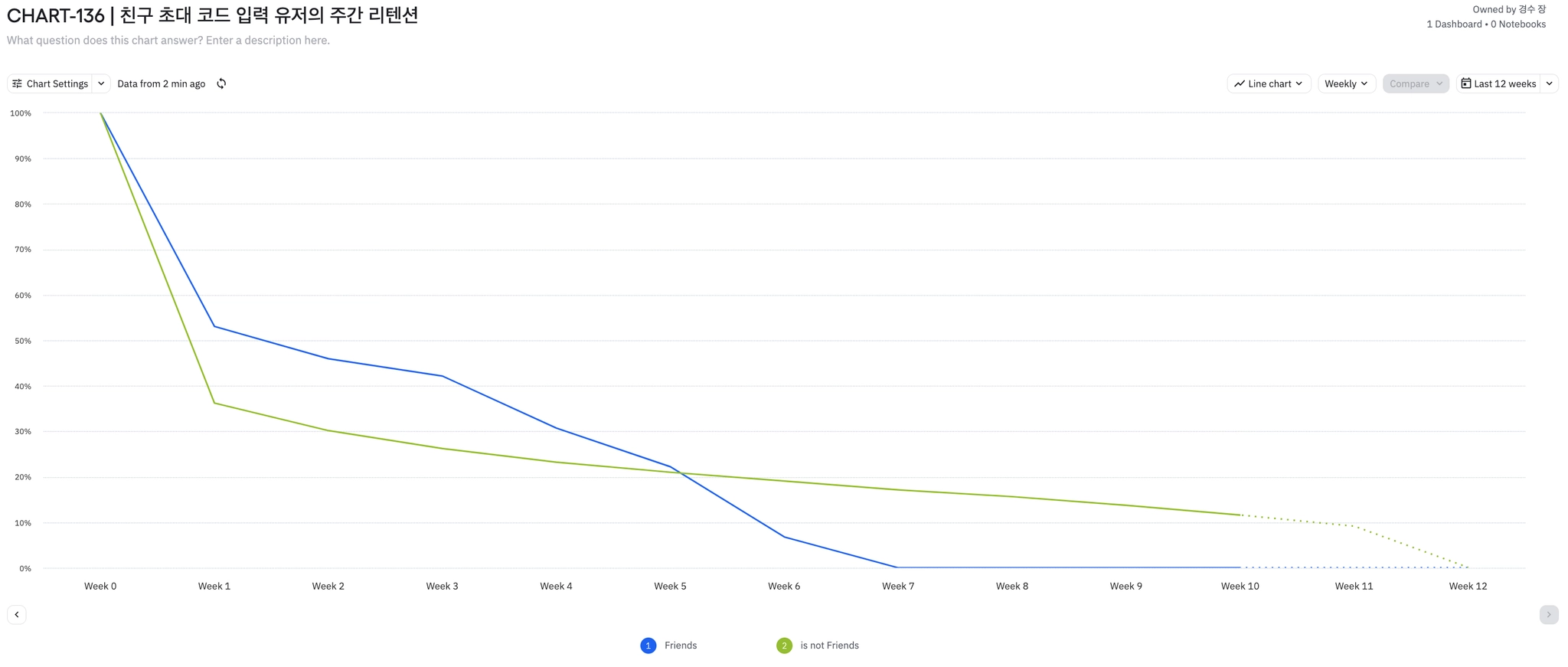 주간 리텐션 5주까지 친구 초대 코드가 없는 유저보다 친구 초대 코드가 있는 유저의 리텐션이 높다. (전 주는 4주까지 리텐션이 높았음)