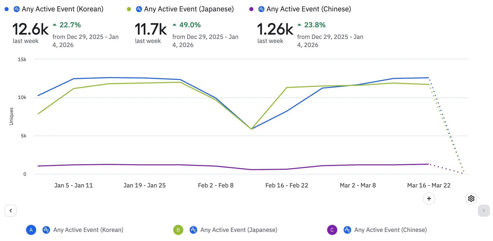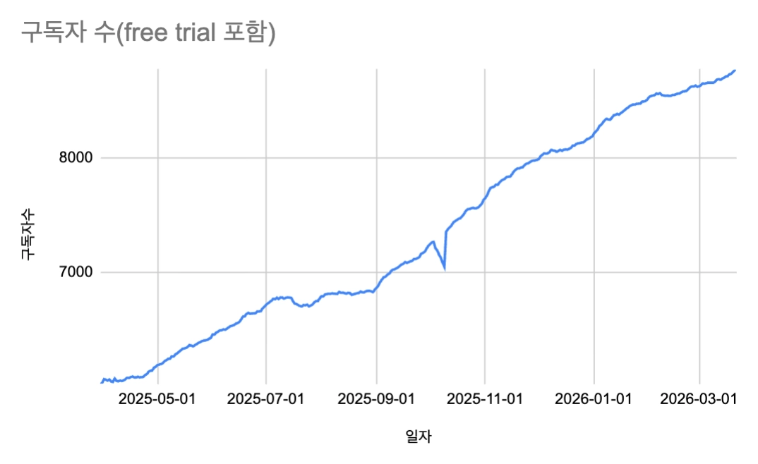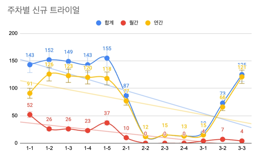 트라이얼 증가 → 구독 증가 정확히 7일 차이로 추세선 동일하게 이동 중.