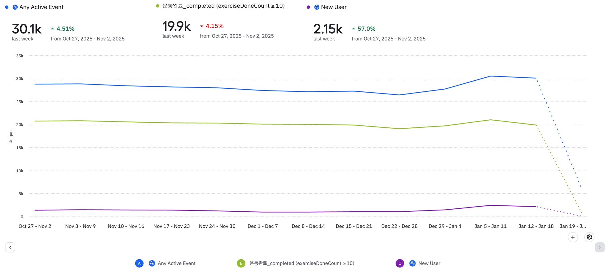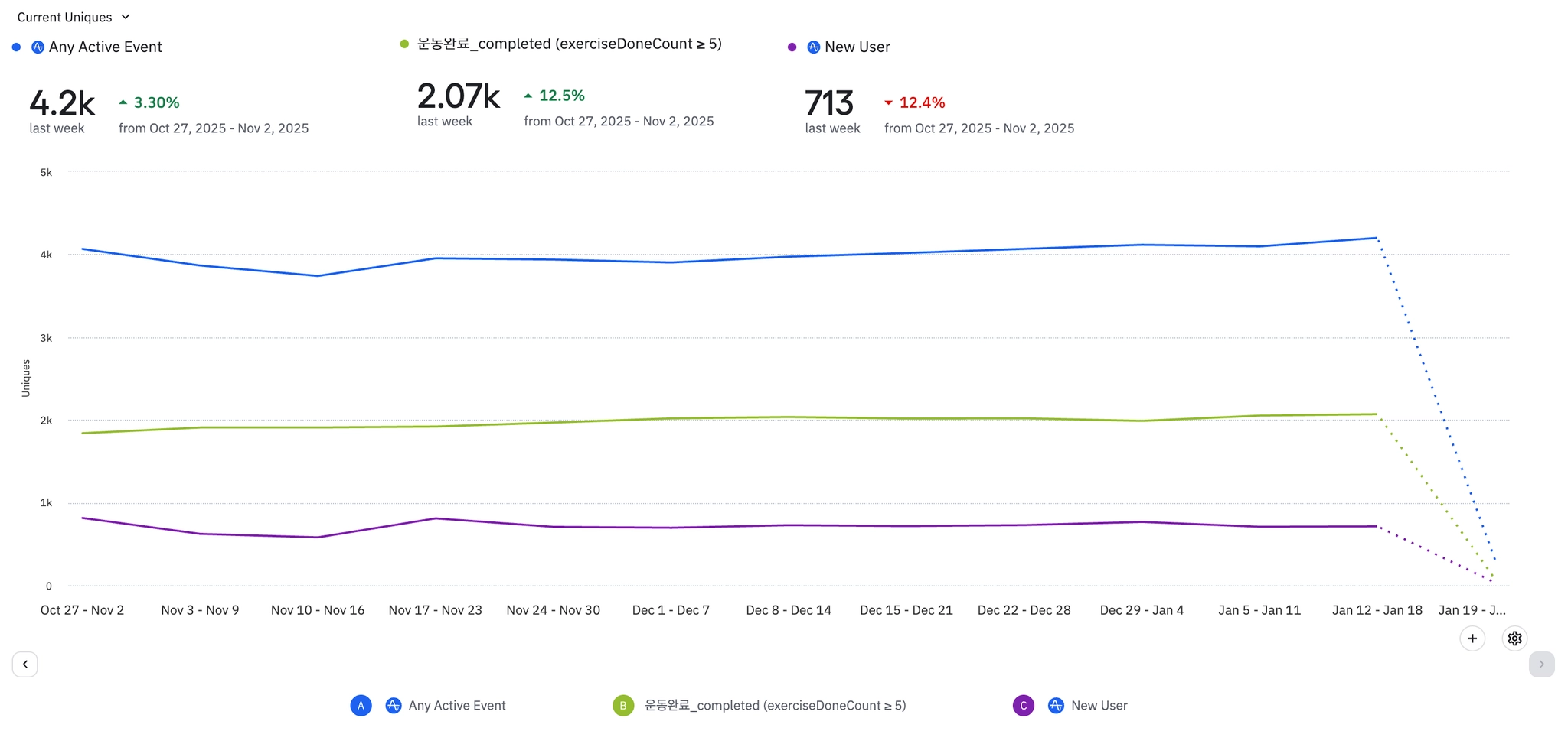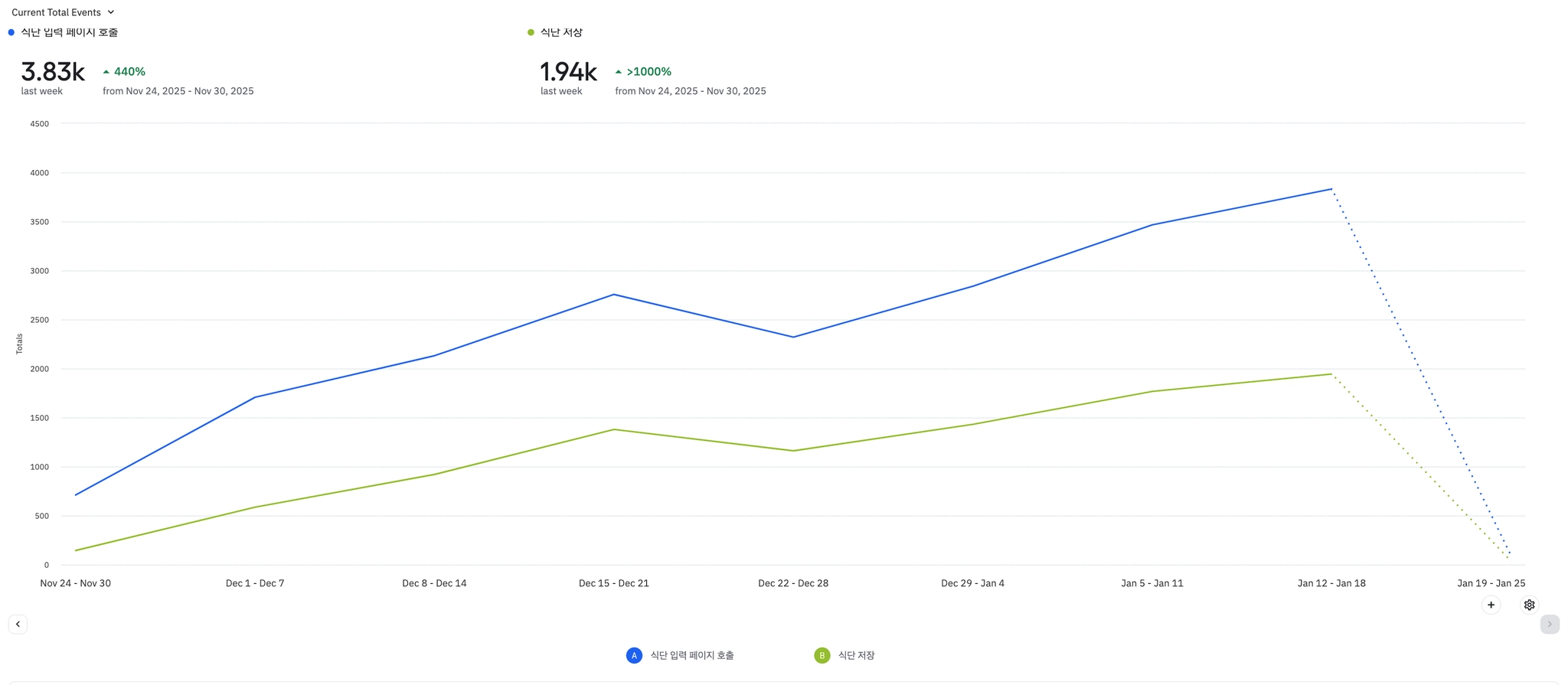 전반적으로 식단 기록 뷰 및 완료 이벤트 수가 증가하고 있는 추세이다.