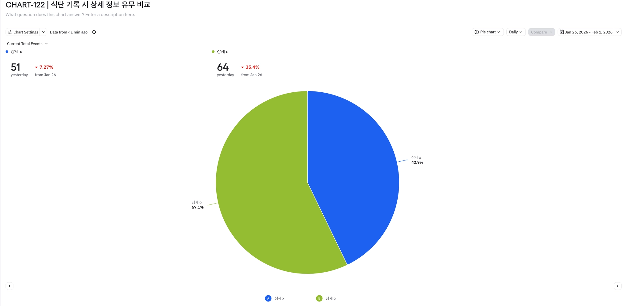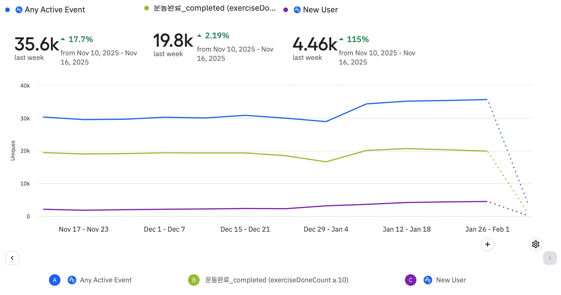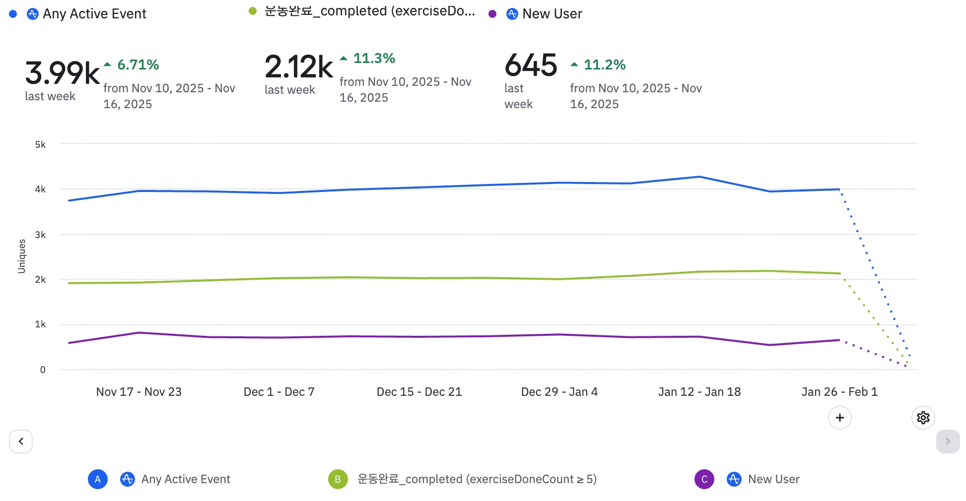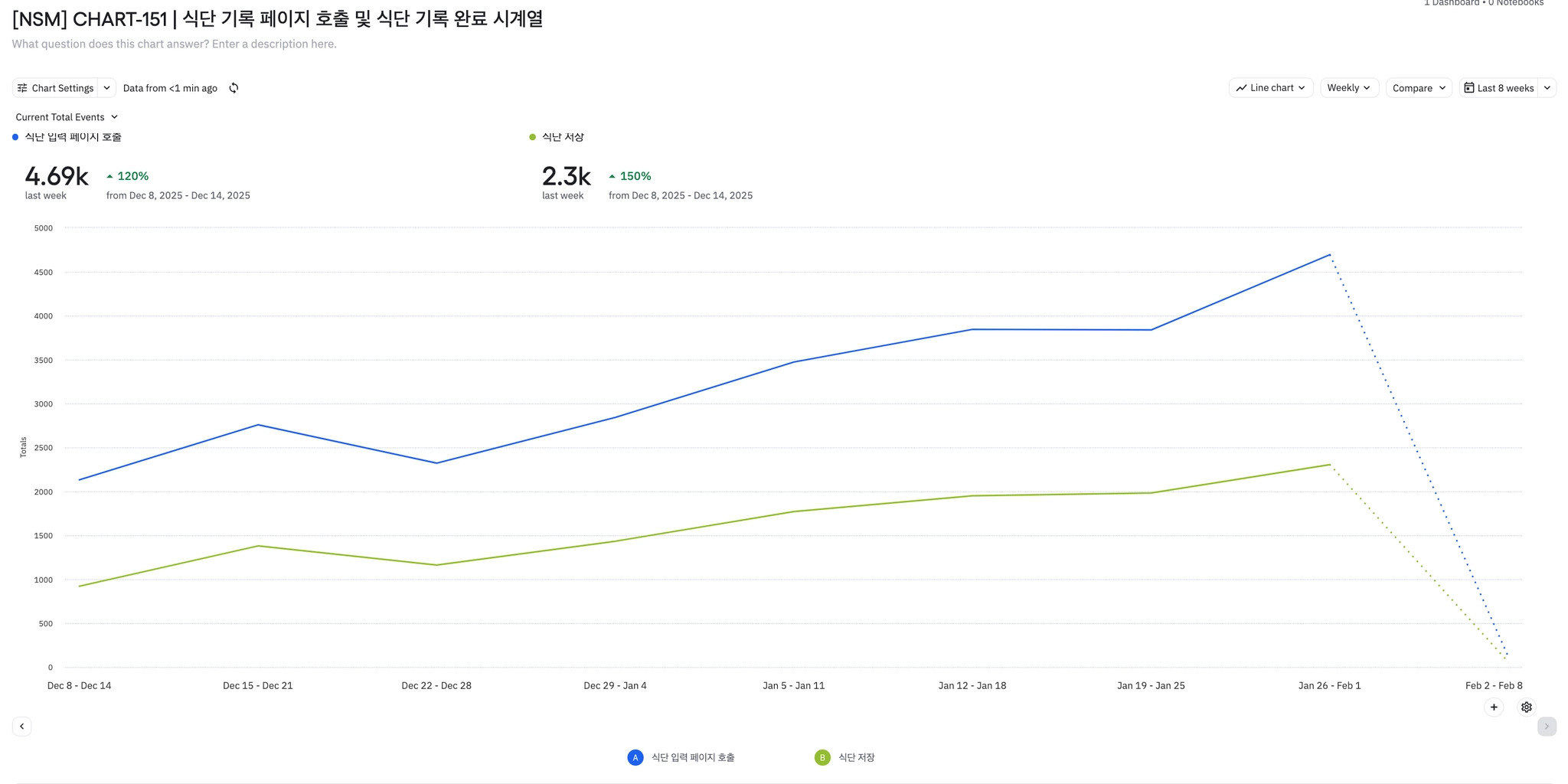 전반적으로 식단 기록 뷰 및 완료 이벤트 수가 전 주대비 크게 증가되고 있다.