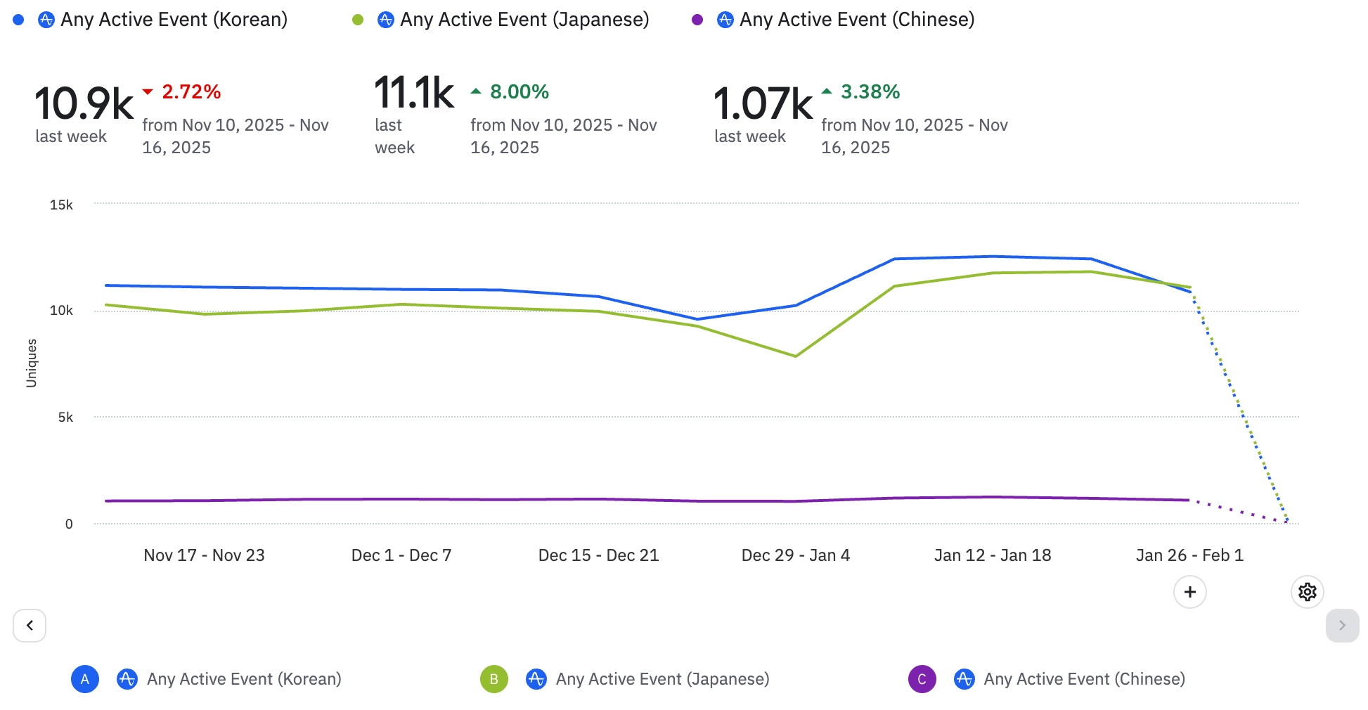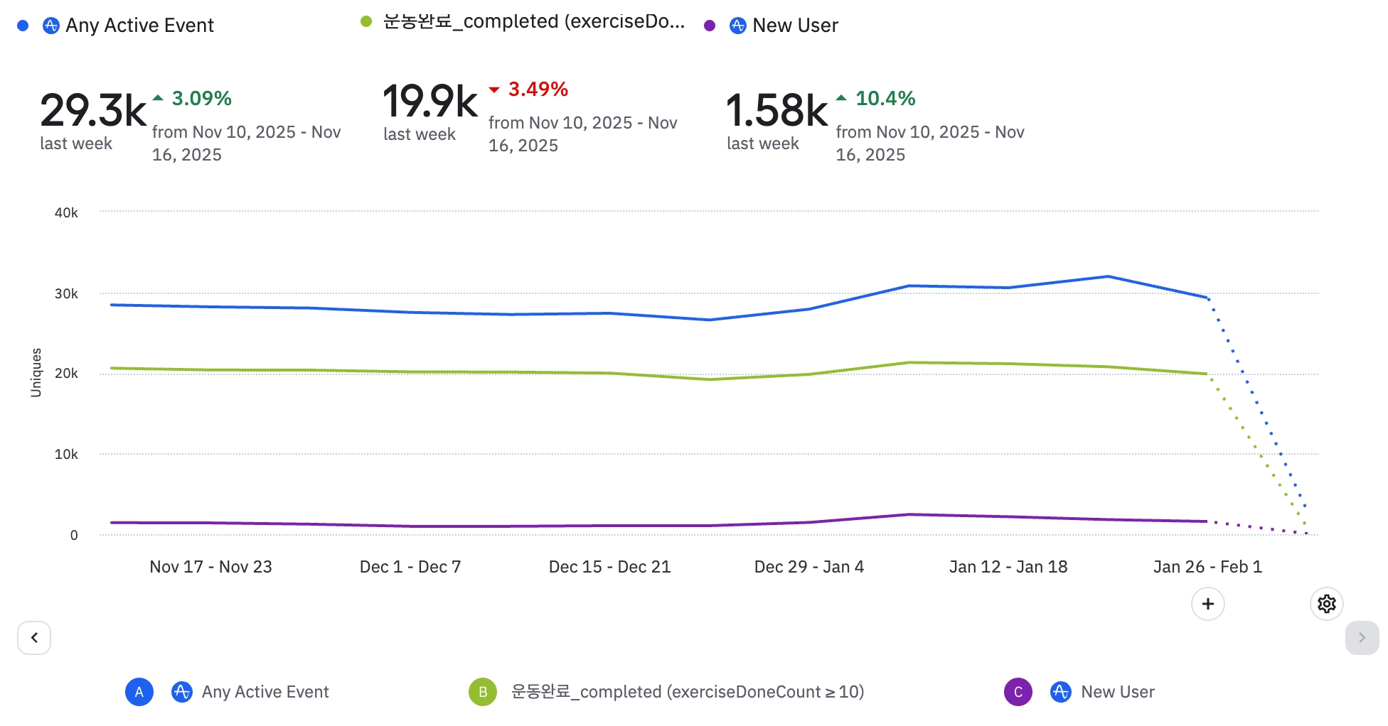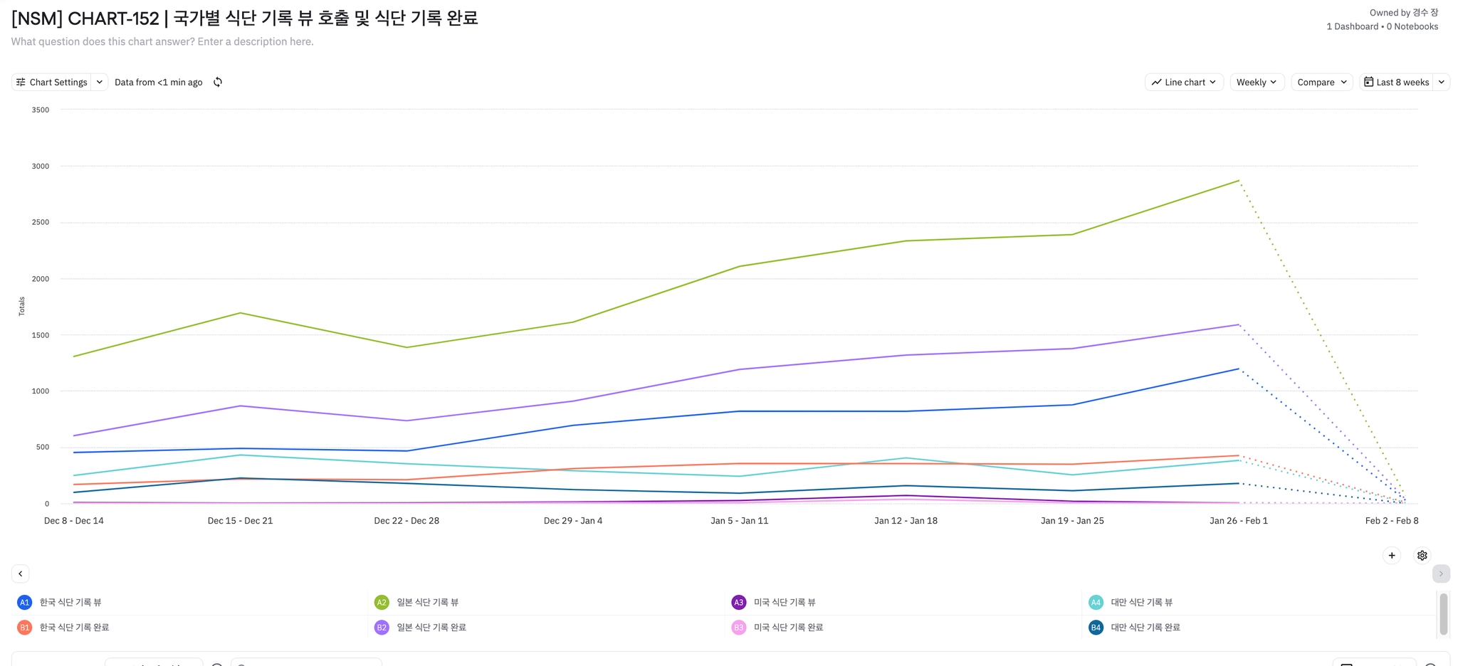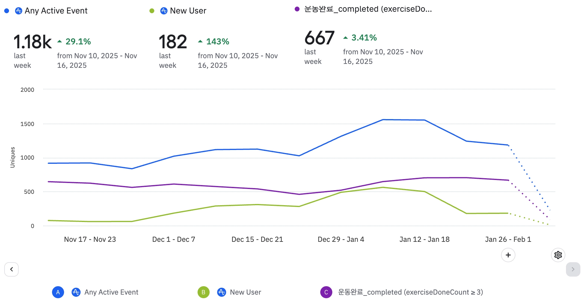 전반적으로 식단 기록 뷰 및 완료 이벤트 수가 전 주대비 크게 증가되고 있다.