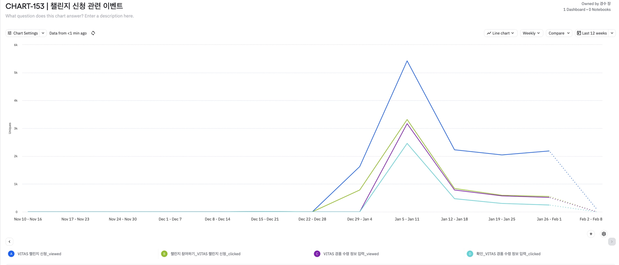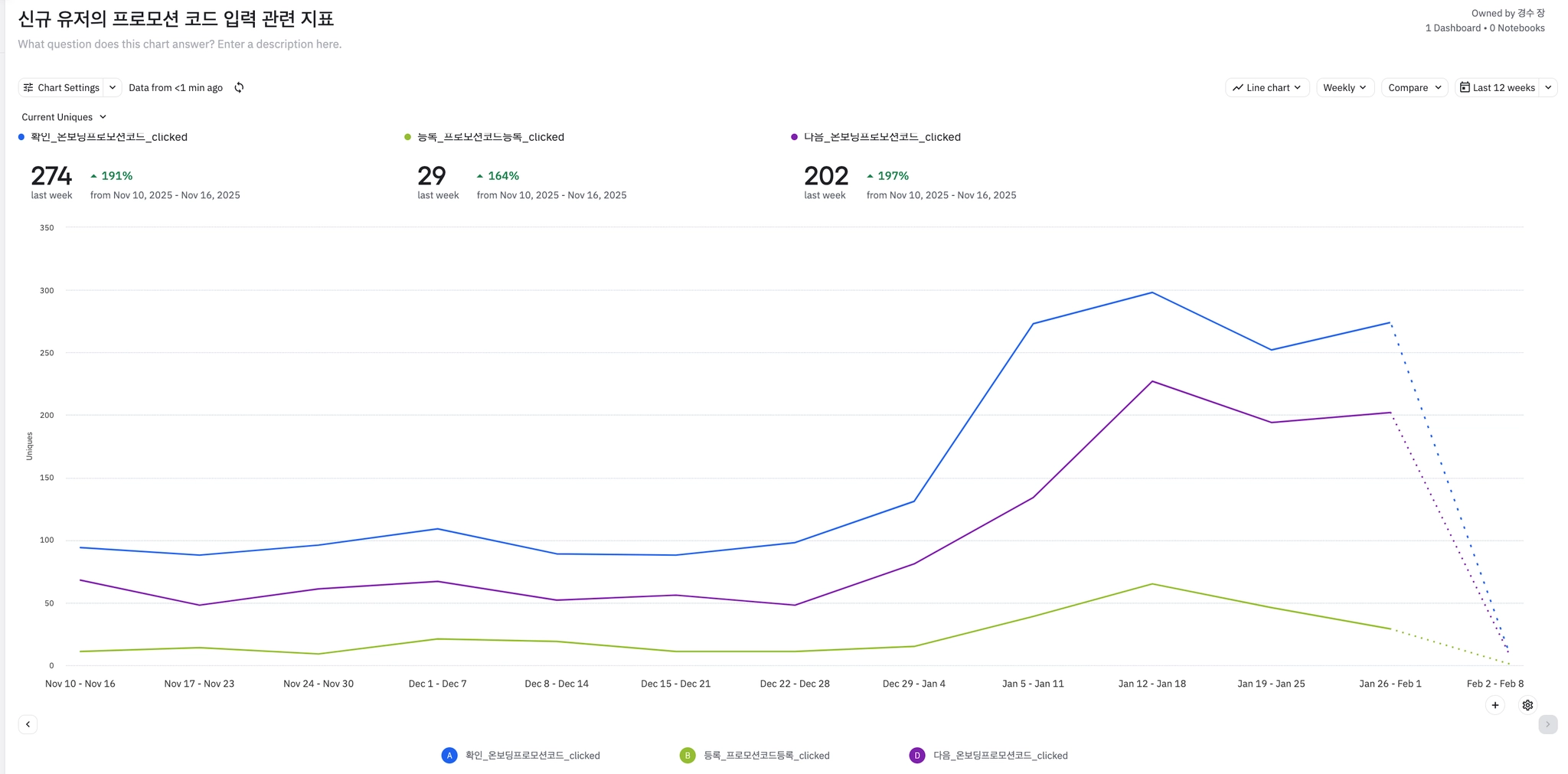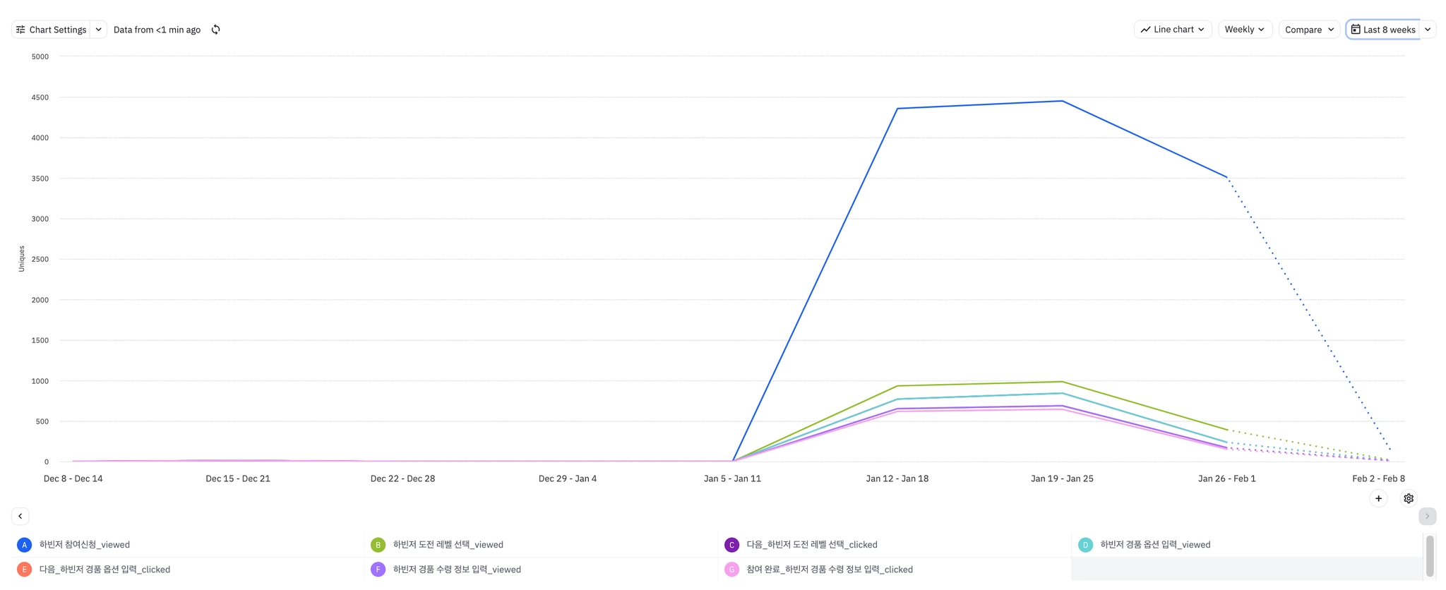 초대 코드 입력 페이지 관련 이벤트와 반대로 전 주 대비 입력 시도는 증가하였으나 실제 완료된 이벤트는 감소 (신규 유저 유입 + 코드에 관심?)