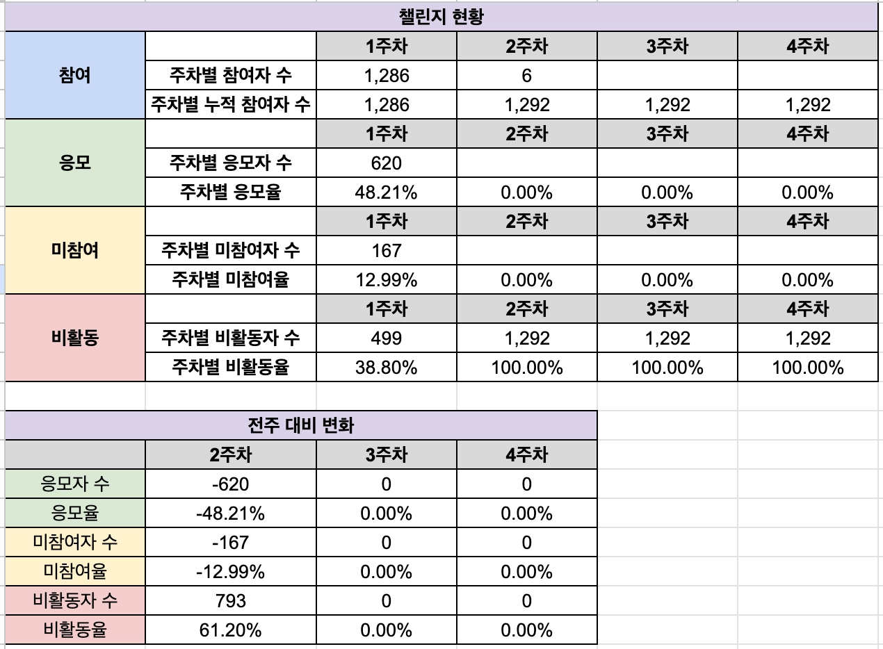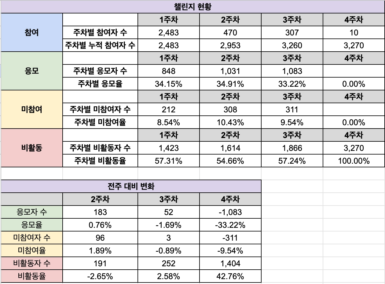 3주차 참여자 수는 감소 폭이 네이처캔보다 적었지만 응모자, 미참여자가 감소하고 비활동자가 증가하였다.