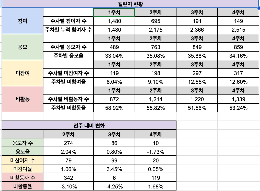 3주차 참여자 수는 감소 폭이 네이처캔보다 적었지만 응모자, 미참여자가 감소하고 비활동자가 증가하였다.