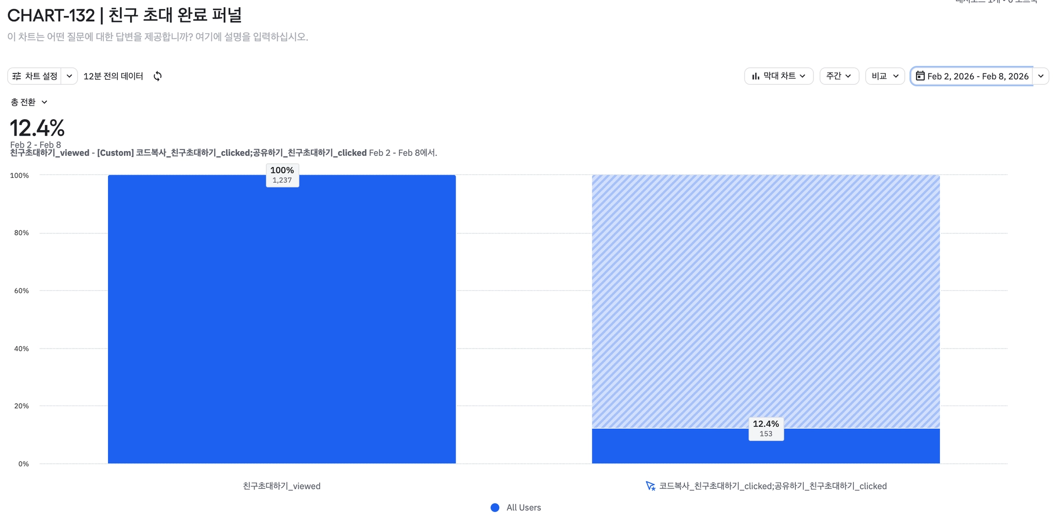 친구 초대 관련 이벤트 수가 전 주 대비 하락하였으나 공유 전환율은 회복하였다.