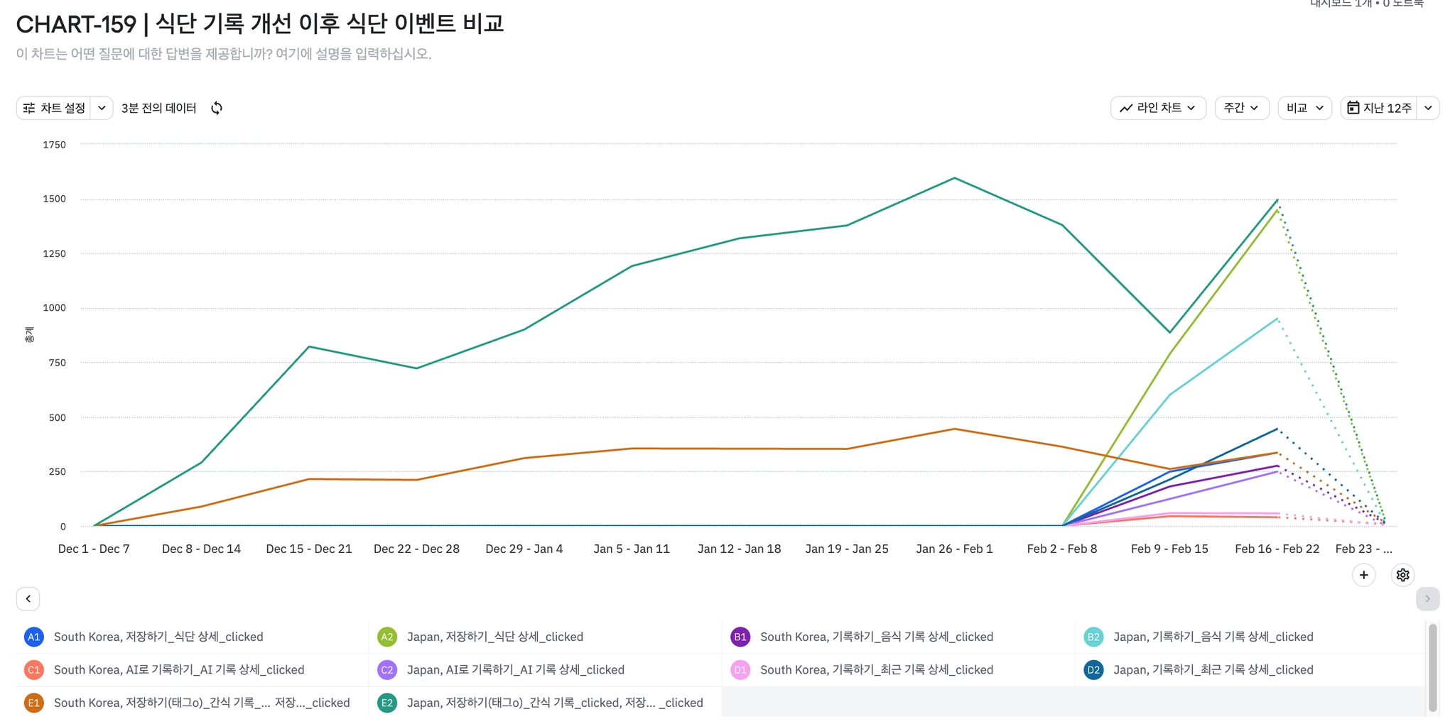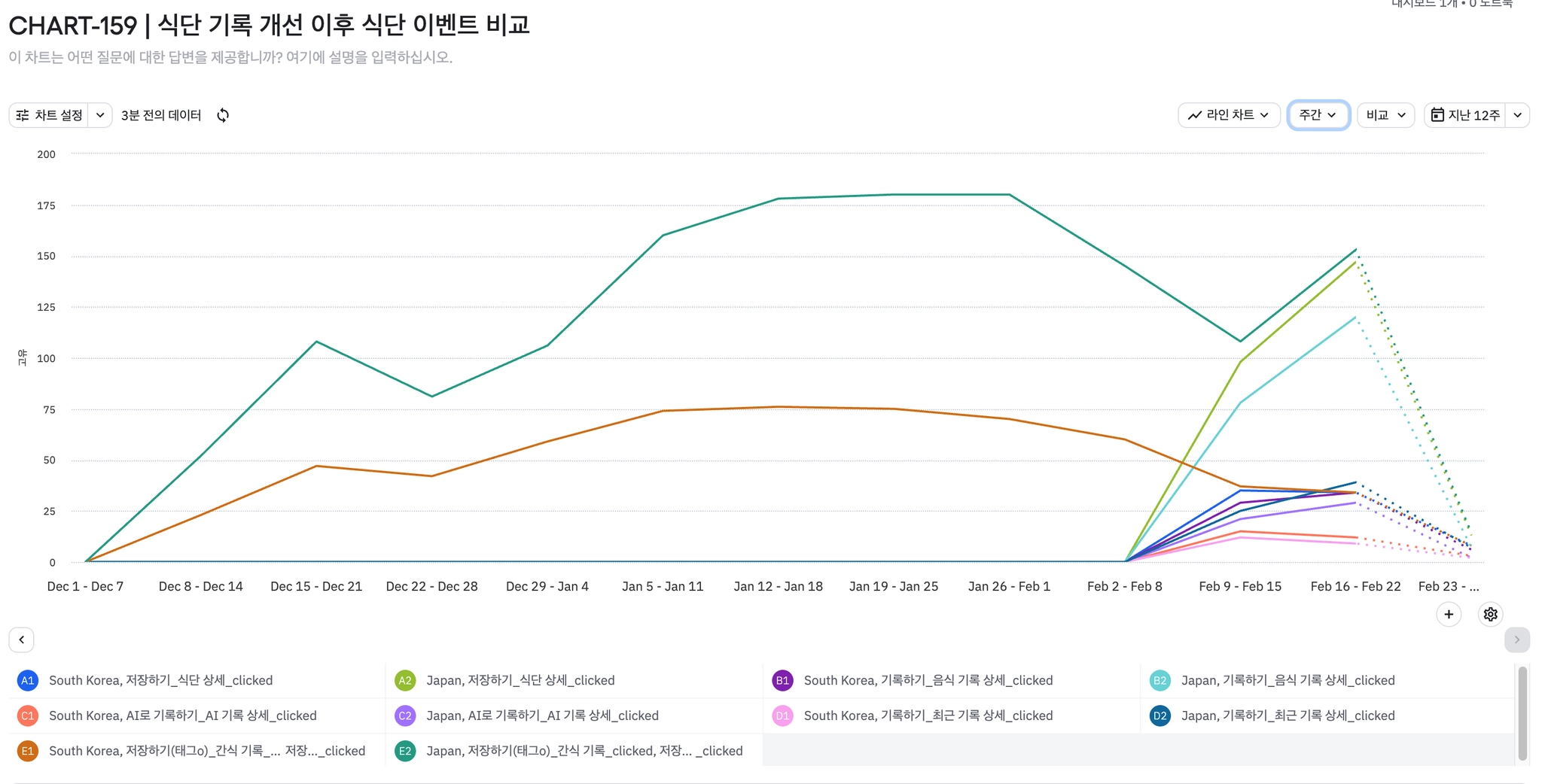주차별 신규 구독(감소 - 일본 구독 신규 67% 감소 : 103 → 34건)