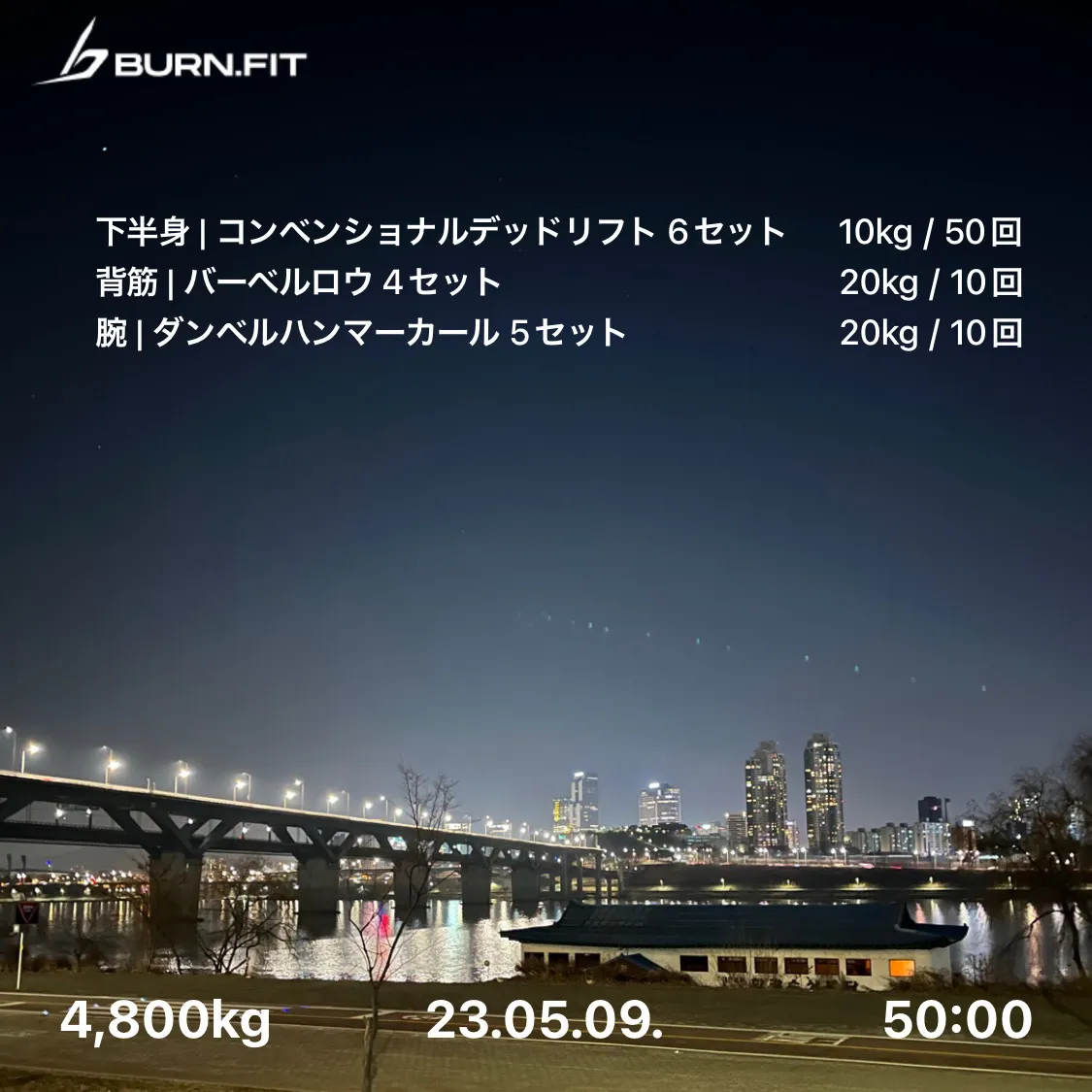 バーンフィットで運動を完了したトレーニング記録と共にハッシュタグ