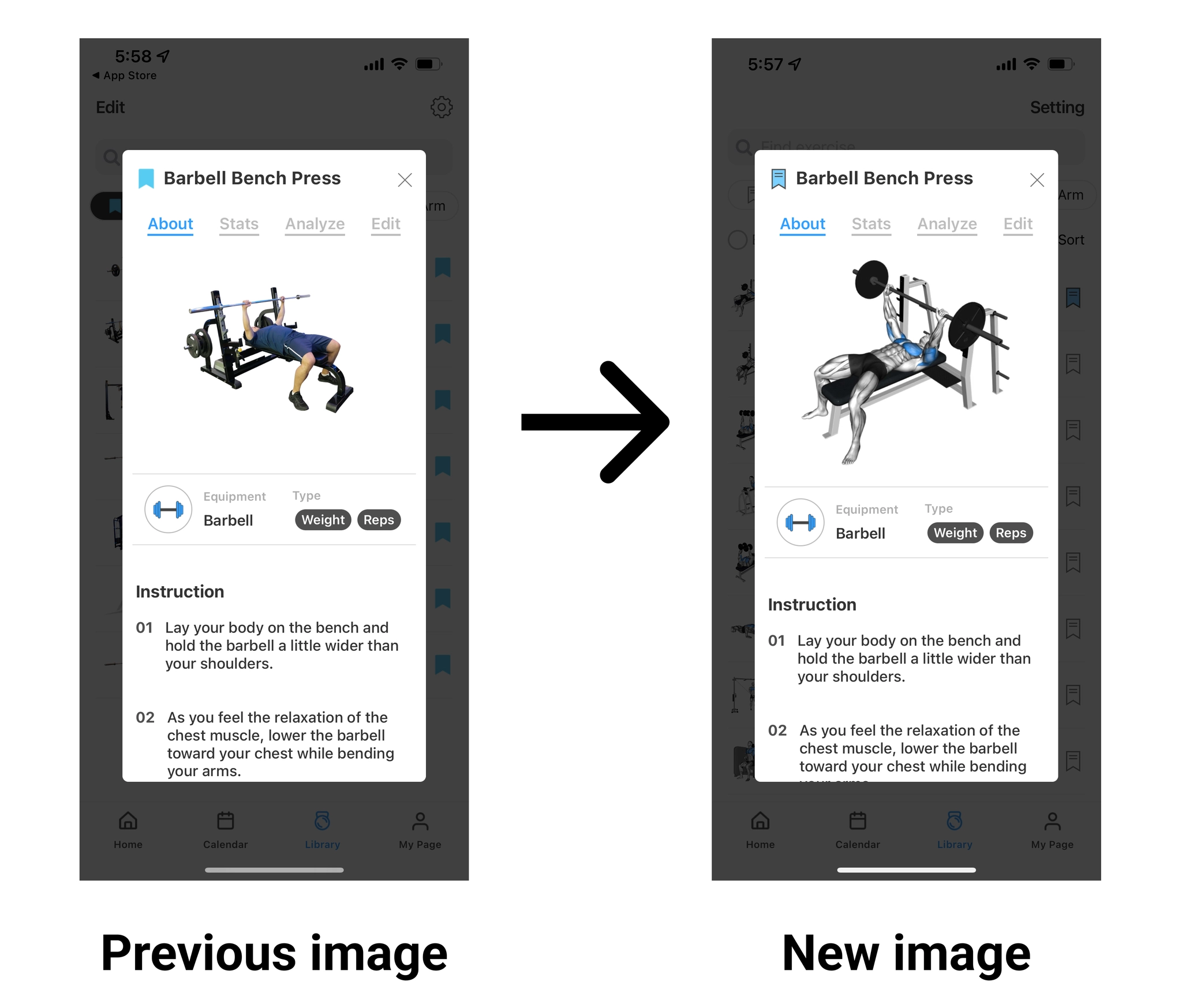 We changed old workout images to new images! In the new images, you can see the muscles used and detail performance by each exercise
