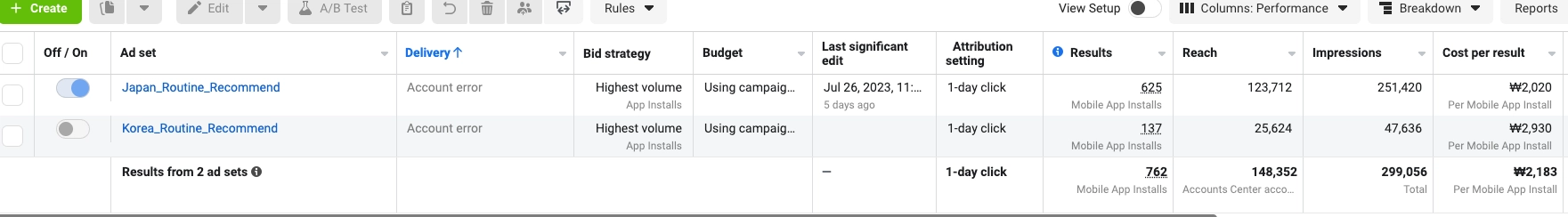 한국&일본 모두 꺼둠. →기대보다 결과가 좋지는 않아 조기 종료하고 에이전시 및 블로그 작업