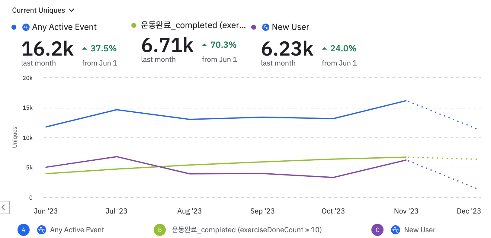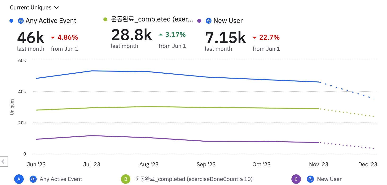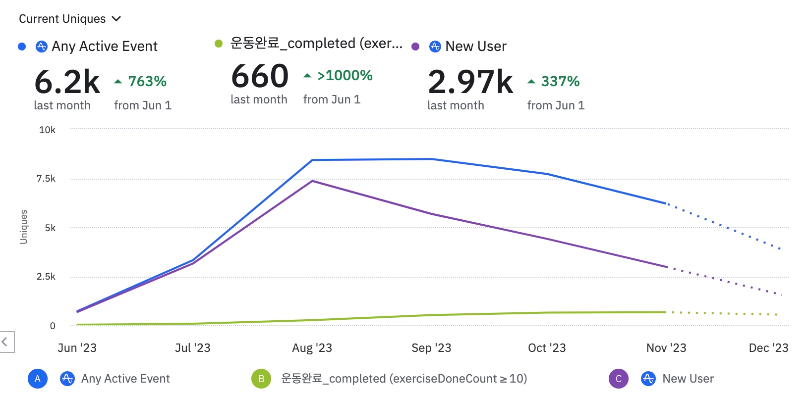 9월 이후 인플루언서 PR을 더이상 진행하지 않으면서 신규 유저와 함께 MAU 수치가 전반적으로 빠지고 있습니다. 충성 유저 숫자는 지속적으로 증가하고 있지만 구독자 숫자가 누적되지 않는다는 이슈가 있습니다.