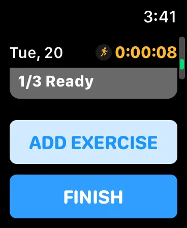 On the watch, there is an 'Add Exercise' button at the very bottom of the exercise list screen.