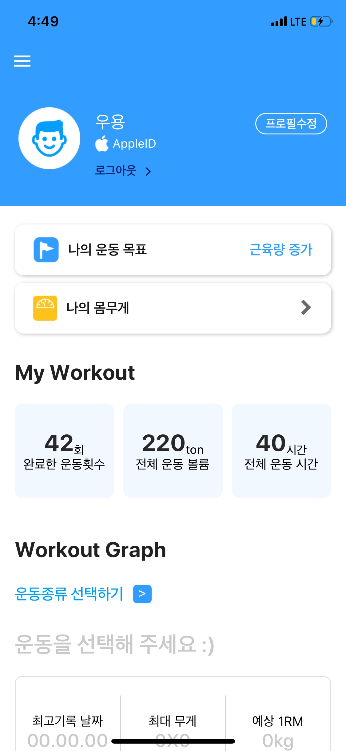 운동 중, 운동 완료, 휴식페이지에서 그 날의 몸무게를 기록할 수 있습니다.